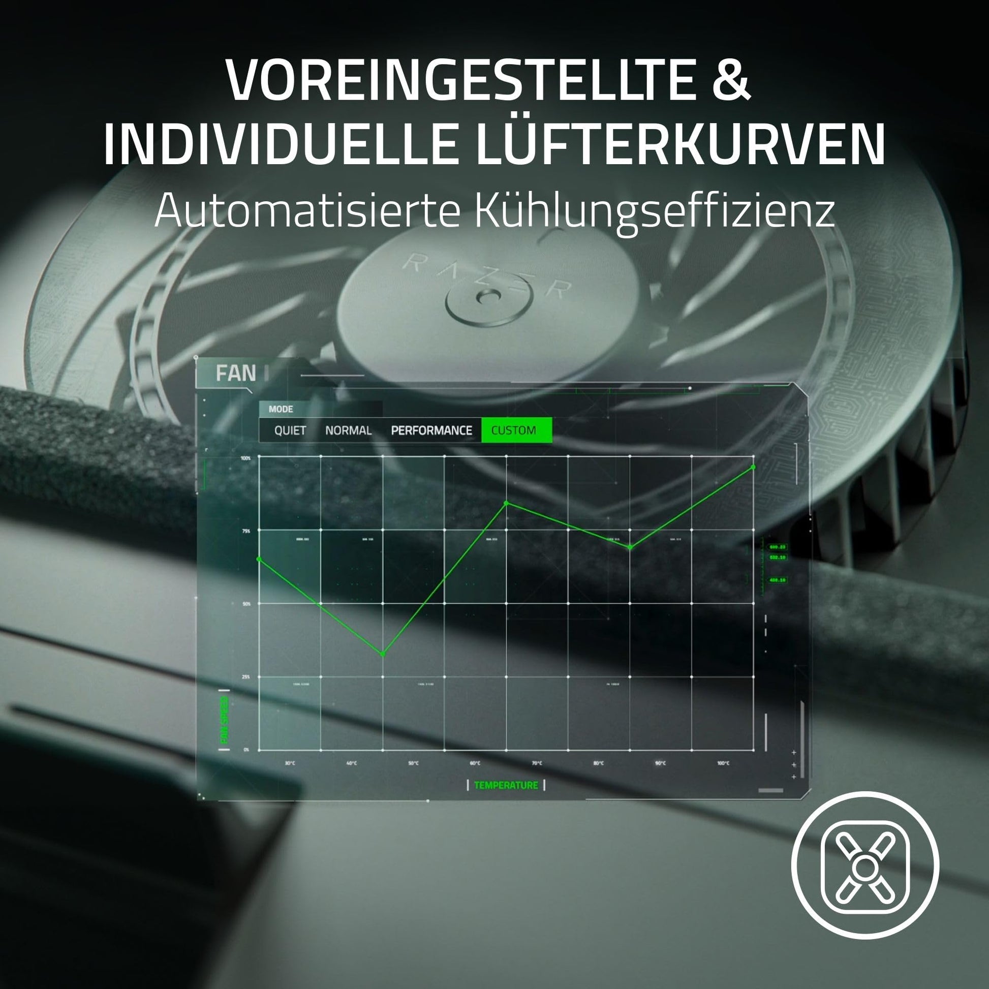 - Personalisierbare Kühlprofile: Wählen Sie aus vordefinierten Lüfterkurven oder erstellen Sie über die Razer Synapse Software Ihr eigenes Profil, um die Kühlung perfekt auf Leistung oder Geräuschentwicklung abzustimmen.