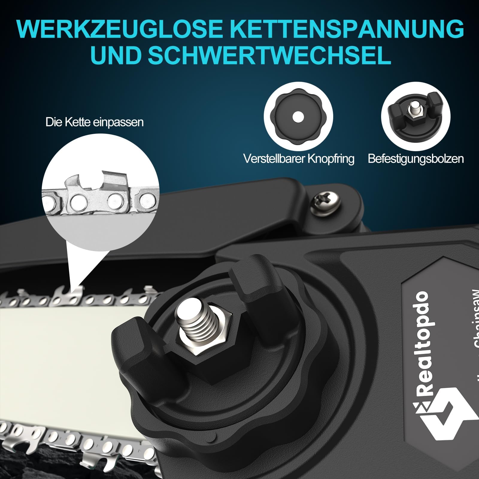 - Werkzeuglose Kettenspannung: Einfaches Justieren und Wechseln der Kette über einen praktischen Drehknopf, ganz ohne zusätzliches Werkzeug.