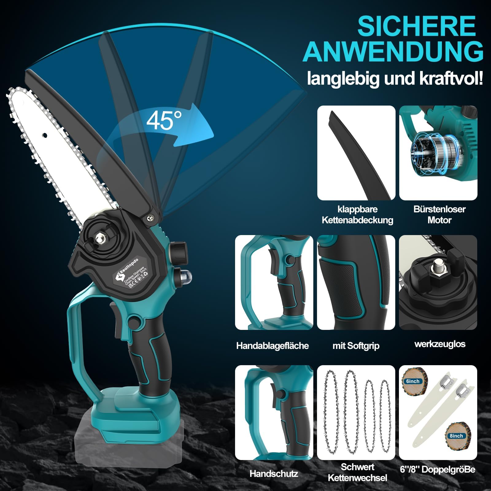 - Lieferumfang: Mini-Kettensäge, 15 cm Führungsschiene & Kette, 20 cm Führungsschiene & Kette, Schutzbrille, Handschuhe, Zubehör.