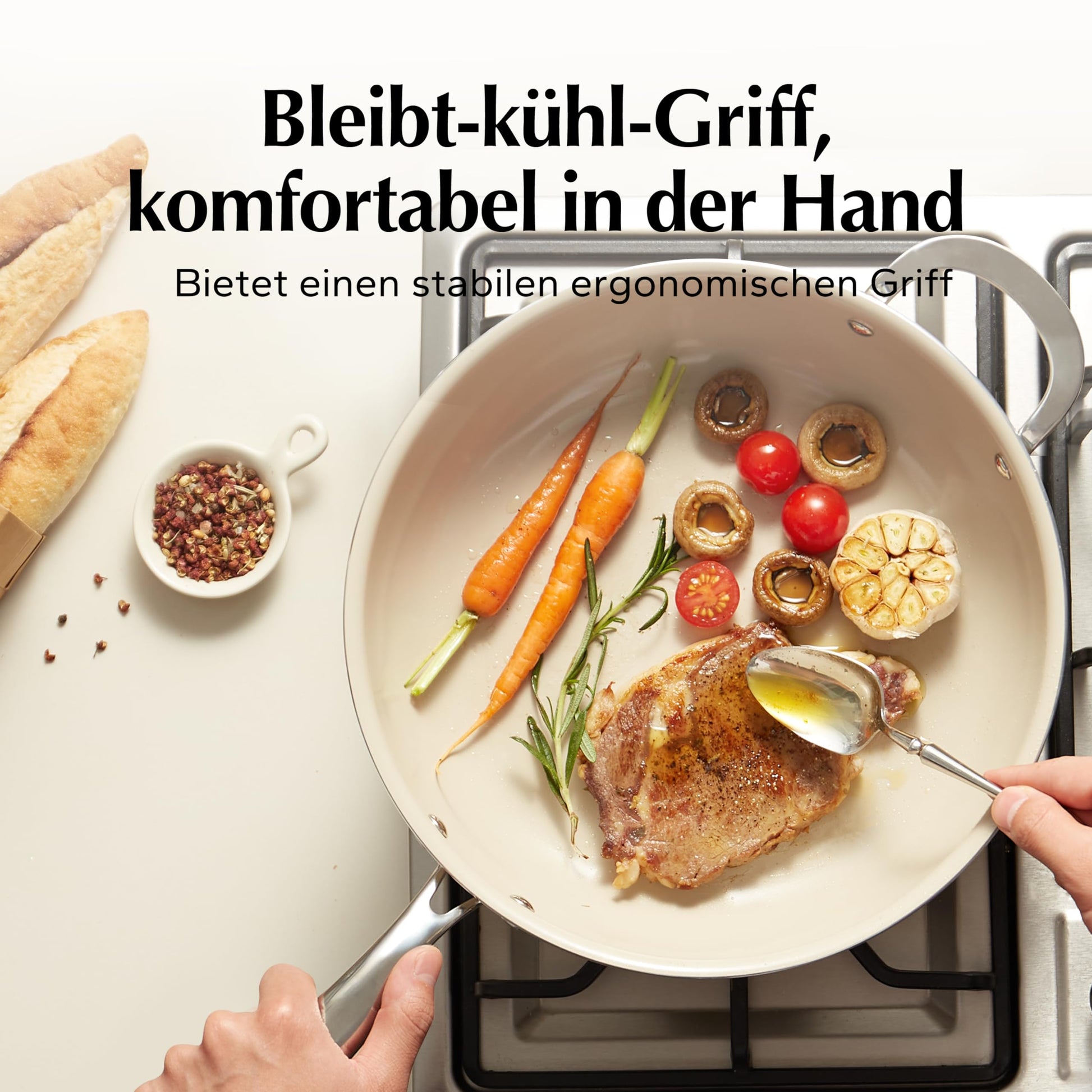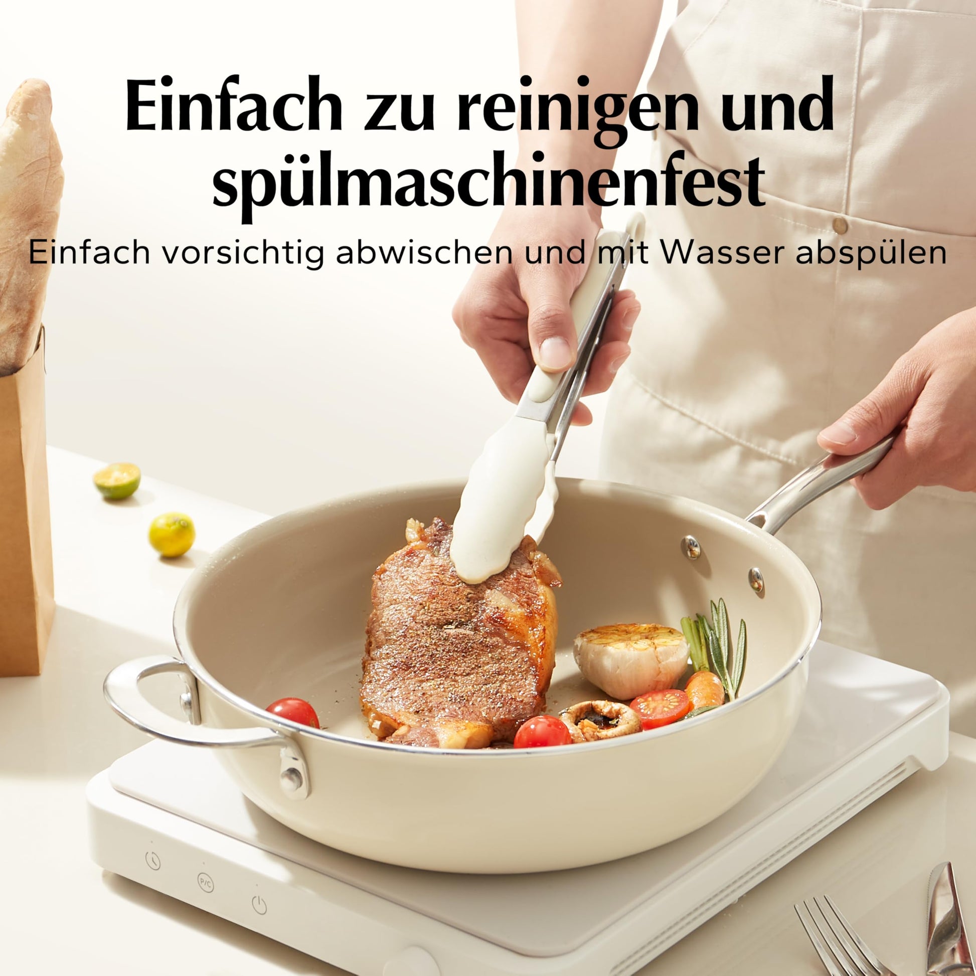 - Gesundheitlich unbedenkliche Keramik-Antihaftbeschichtung, frei von PFAS, PFOA und PTFE.