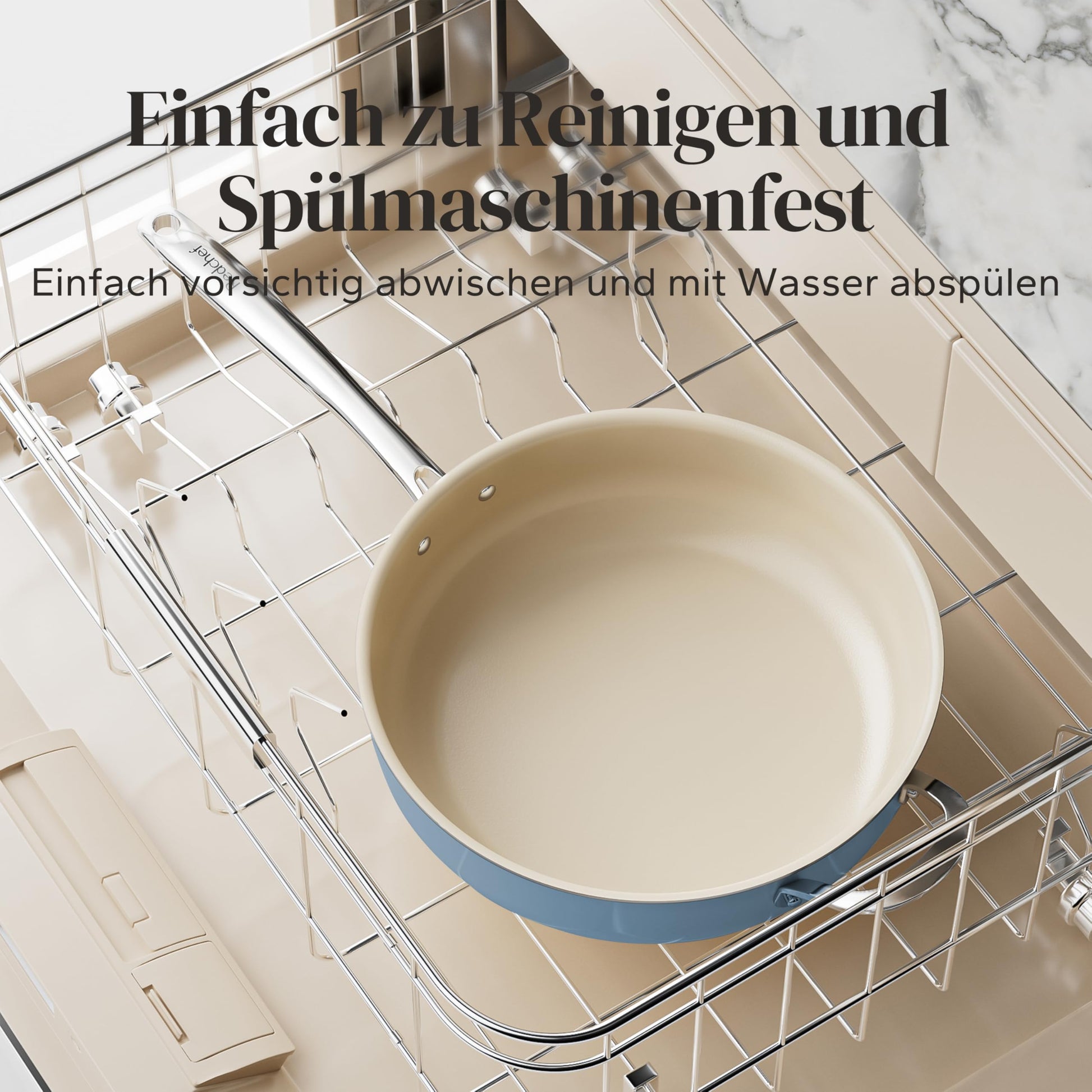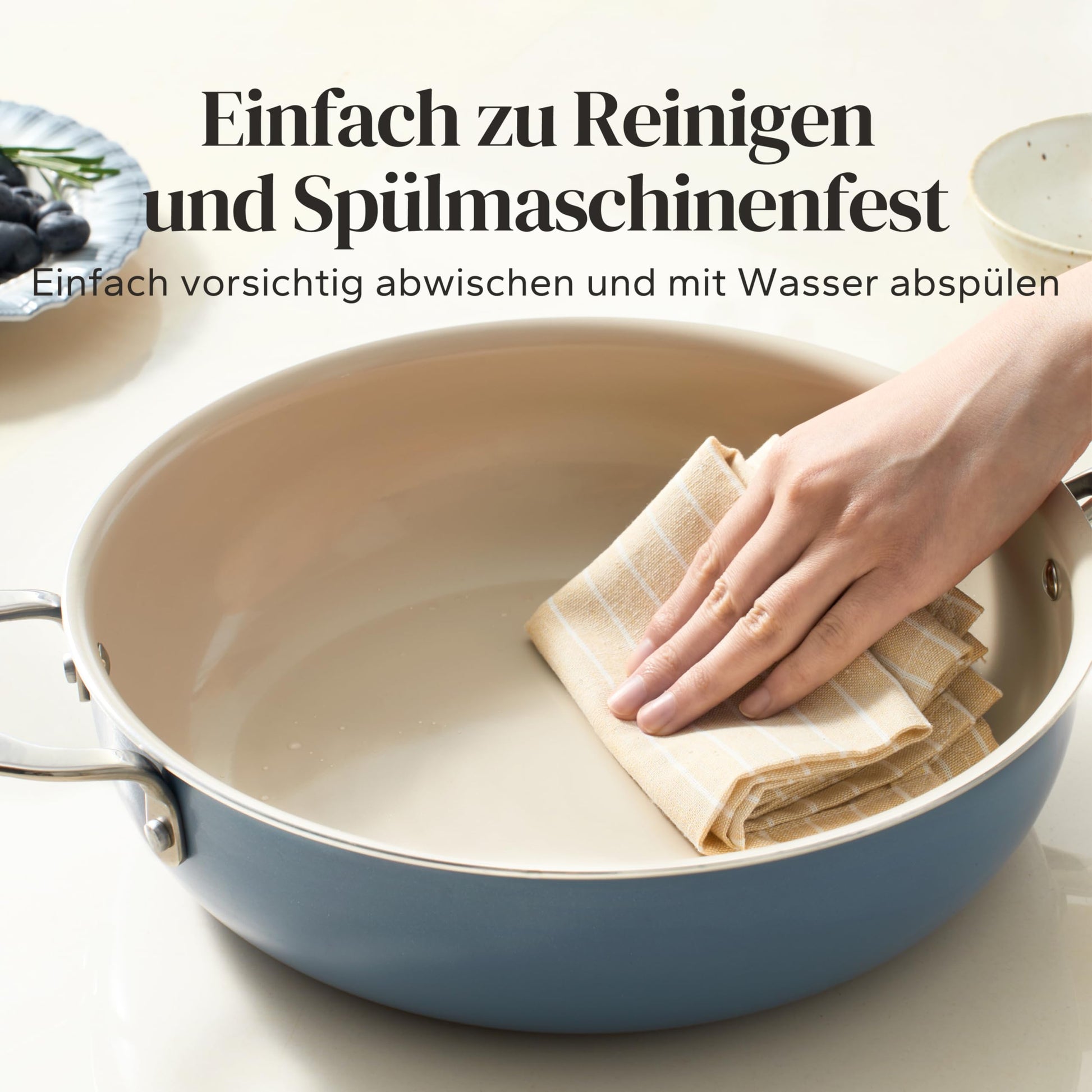 Die Reinigung ist sehr einfach. Dank der glatten Keramikoberfläche haften Speisereste kaum an. Eine schnelle Reinigung von Hand mit warmem Wasser und Spülmittel wird für maximale Langlebigkeit empfohlen. Die Pfanne ist aber auch spülmaschinengeeignet. Um die kratzfeste Beschichtung zu schonen, raten wir zur Verwendung von Küchenhelfern aus Holz oder Silikon.