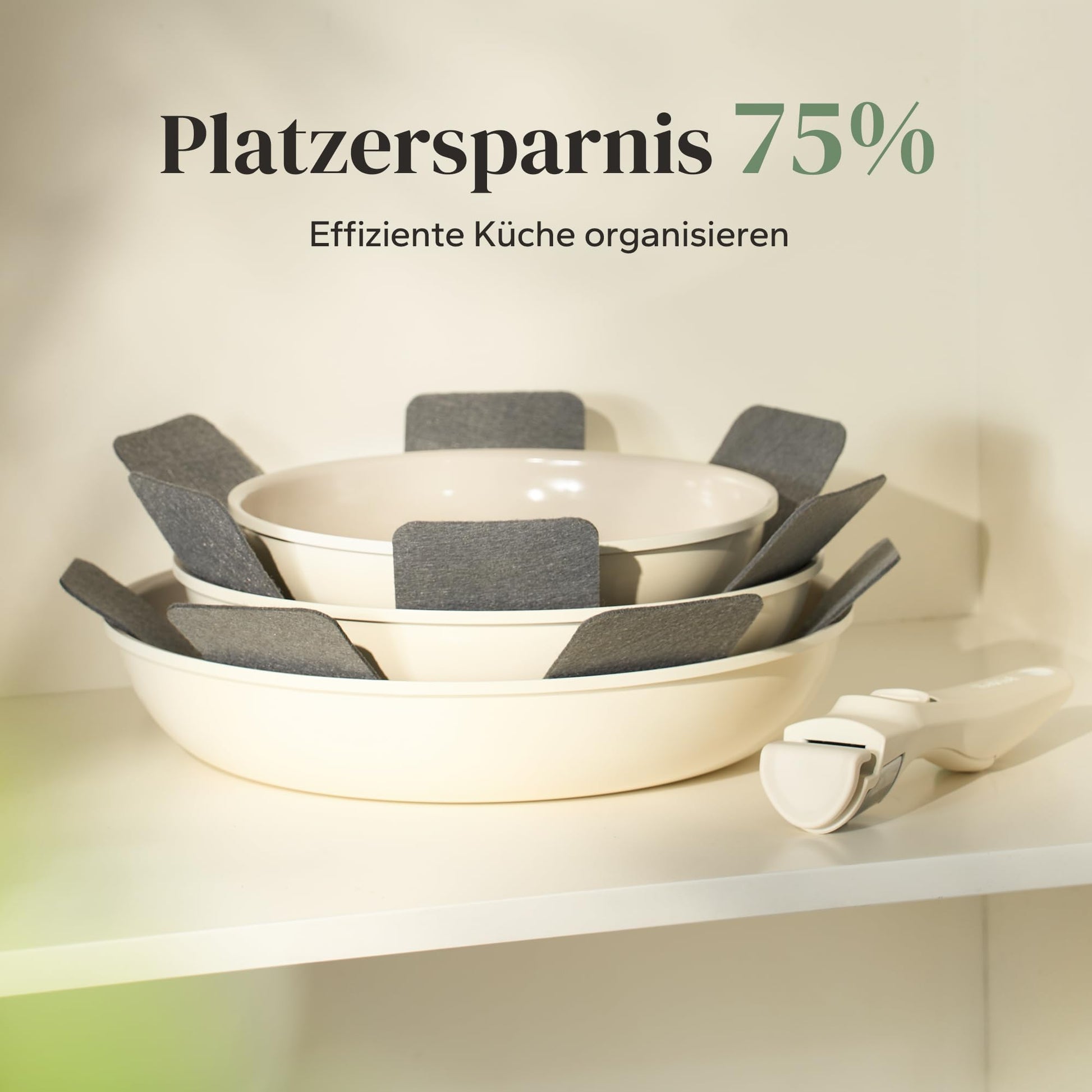 - Extrem platzsparendes Design: Dank des abnehmbaren Griffs und der perfekten Stapelbarkeit der Pfannen sparen Sie bis zu 75% wertvollen Stauraum in Ihren Küchenschränken.