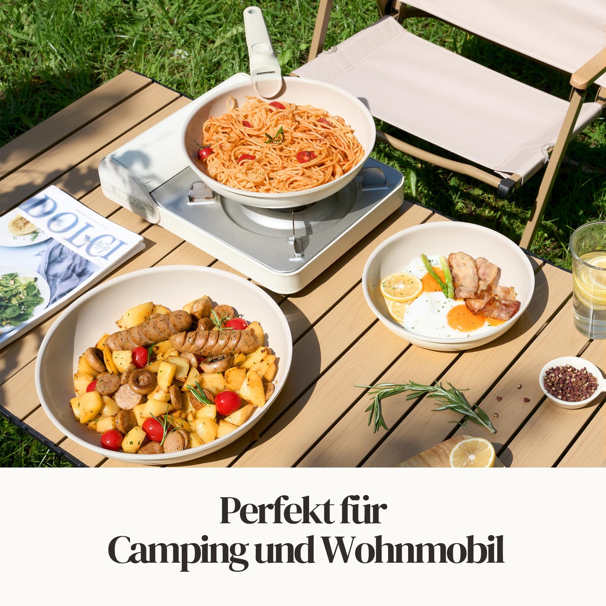 Der grösste Vorteil dieses Sets ist seine unglaubliche Platzersparnis. Durch den einzigen, abnehmbaren Universalgriff lassen sich die drei Pfannen perfekt ineinander stapeln. Das schafft Ordnung und ist ideal für kleinere Küchen, Wohnmobile oder den Campingurlaub.
