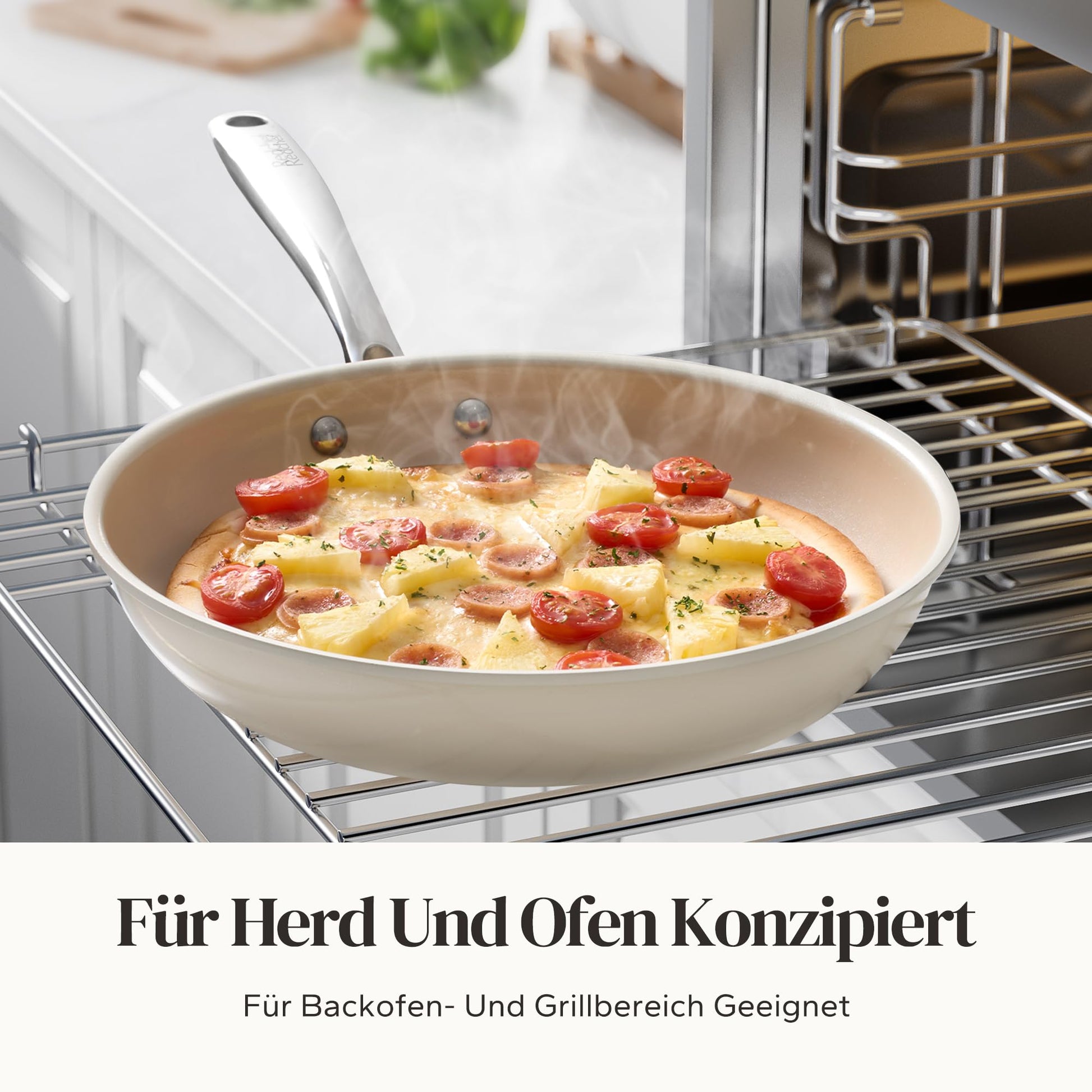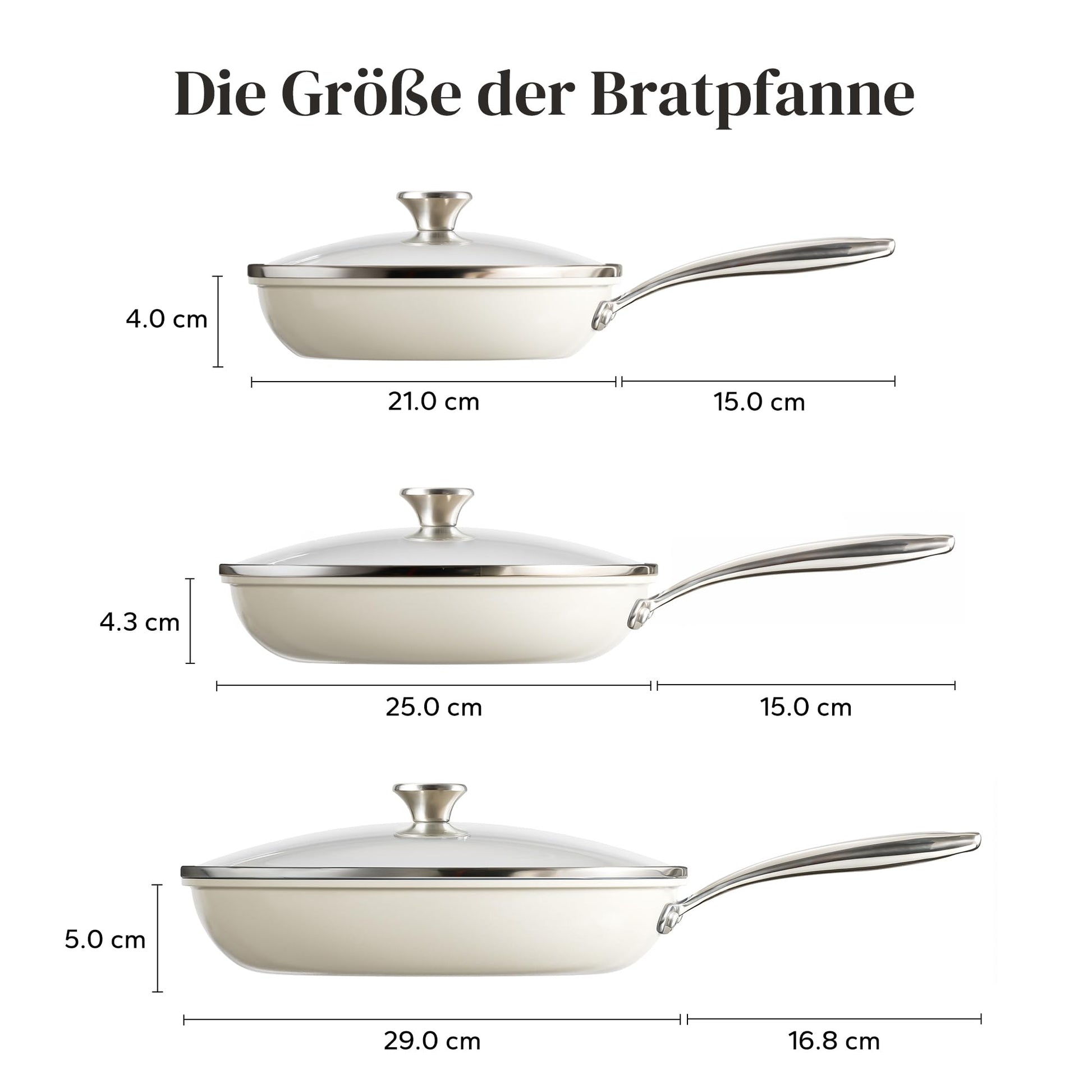 - Hohe Hitzebeständigkeit: Die Pfannen sind backofenfest bis zu einer Temperatur von 450 °C (ohne Deckel).