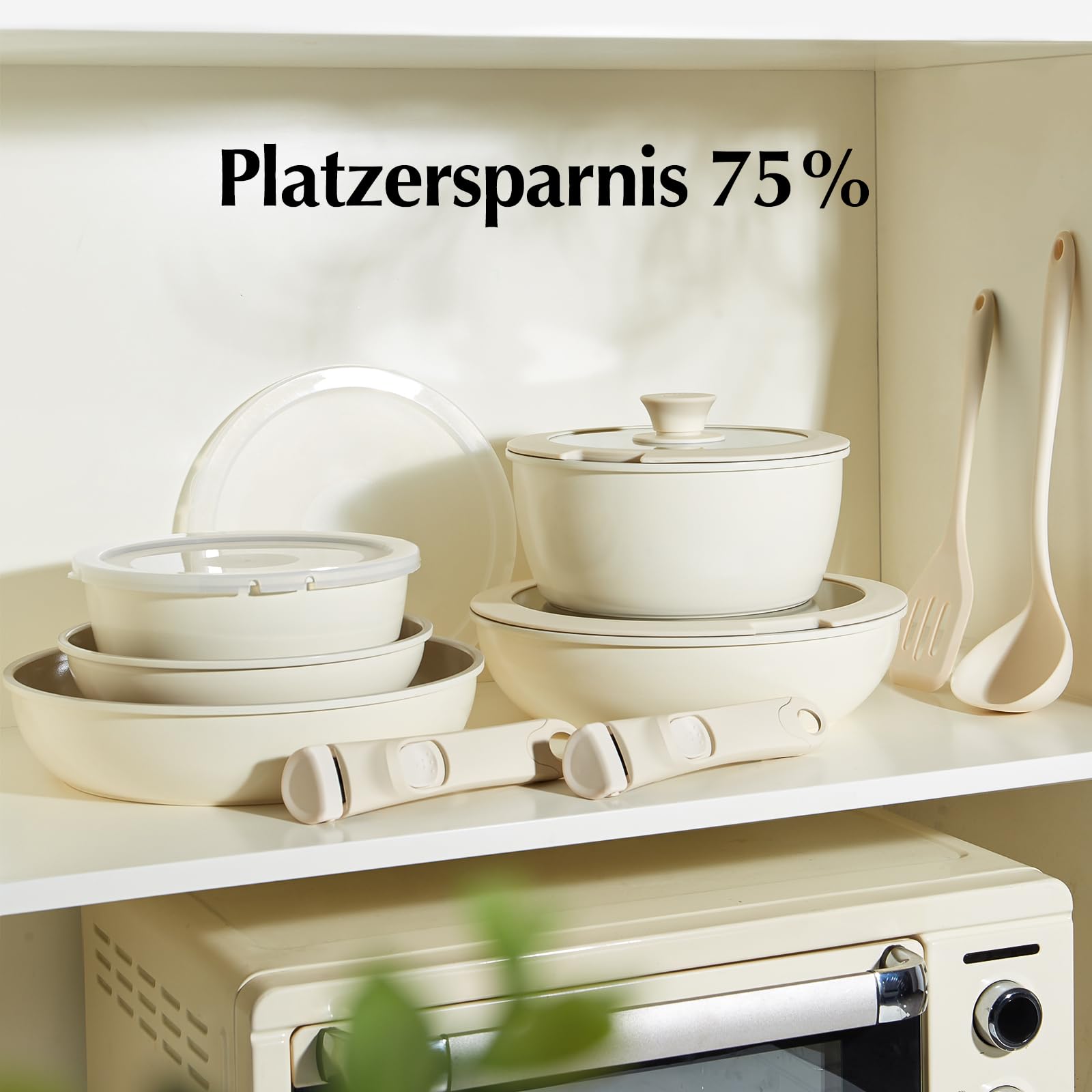 Dank der abnehmbaren Griffe und des intelligenten Designs lassen sich alle Töpfe und Pfannen perfekt ineinanderschachteln. So sparen Sie bis zu 75% Platz im Schrank, was das Set nicht nur ideal für kleine Küchen, sondern auch zur perfekten Lösung für den Einsatz im Wohnmobil oder beim Camping macht.