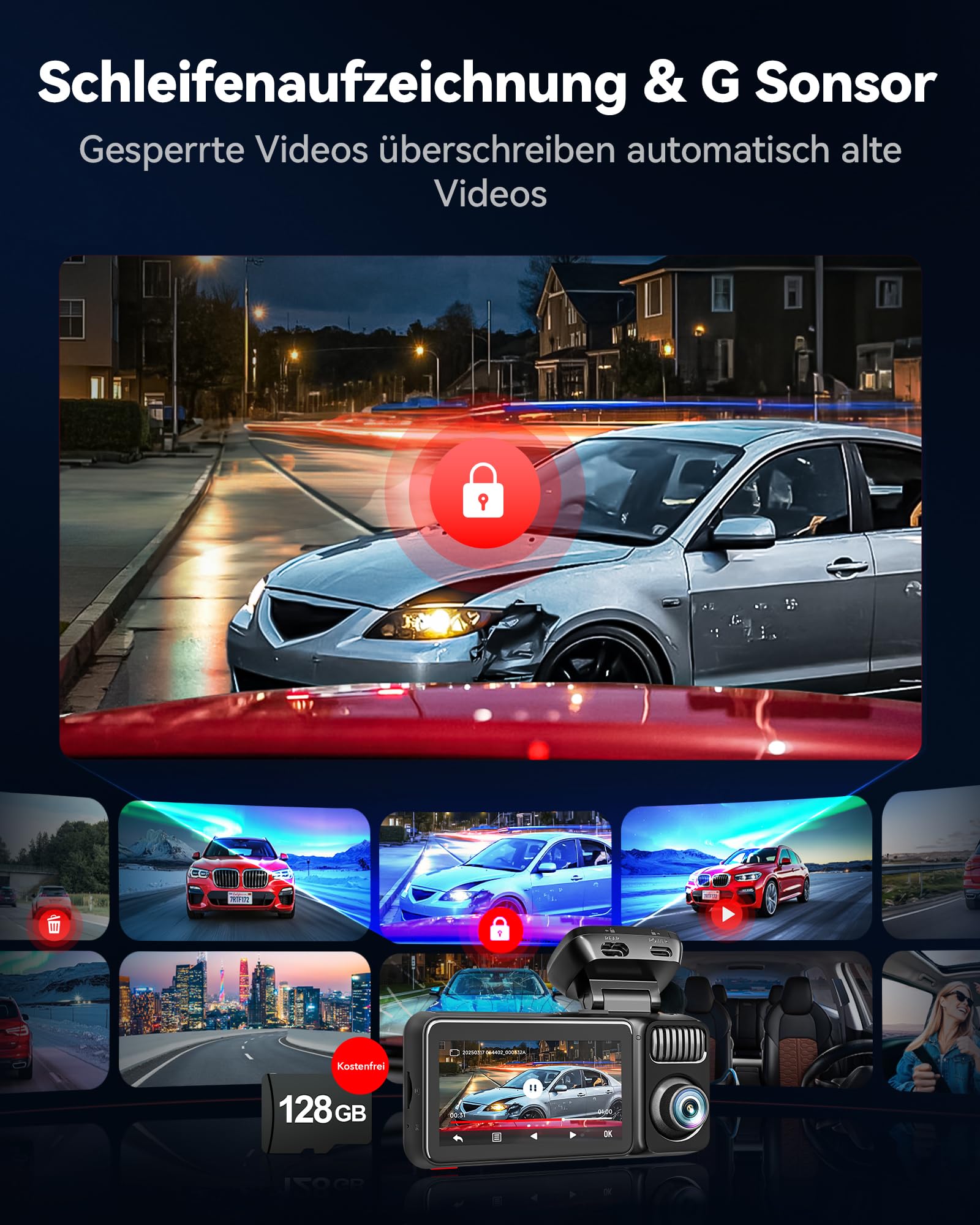 - Aufnahmemodi: 4K+2.5K+1080P (Vorne+Hinten+Innen)