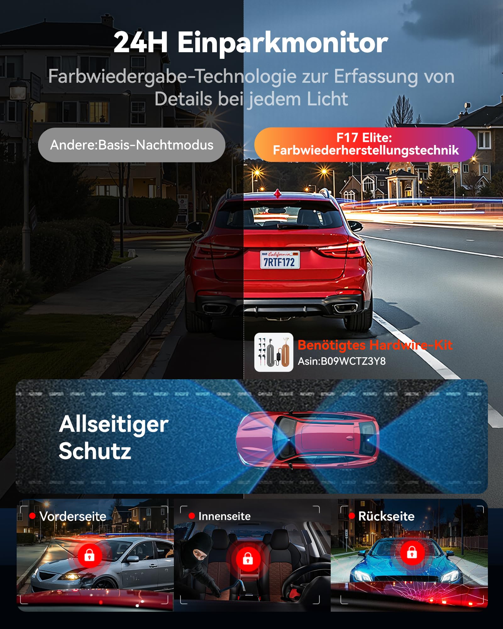 Sicherheit rund um die Uhr: Der intelligente 24/7-Parkmodus mit G-Sensor-Erkennung und Zeitraffer-Aufnahme überwacht Ihr Fahrzeug ununterbrochen. Dank der Farbnachtsicht sind auch verdächtige Aktivitäten im Dunkeln klar erkennbar, was entscheidend für die Identifizierung von Personen oder Fahrzeugen sein kann (separates Hardwire-Kit erforderlich).