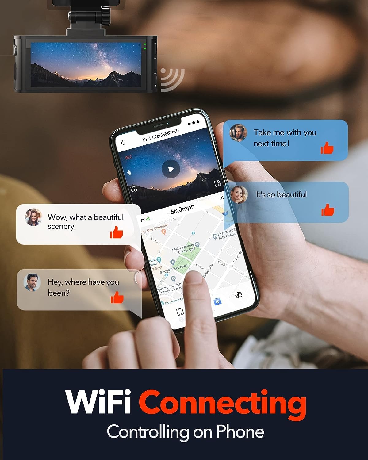 Dank integriertem Wi-Fi können Sie die Dashcam ganz einfach mit der "Redtiger Cam"-App auf Ihrem Smartphone verbinden. Über die App können Sie Live-Bilder ansehen, Aufnahmen verwalten, Videos direkt herunterladen und teilen, ohne die Speicherkarte entnehmen zu müssen.