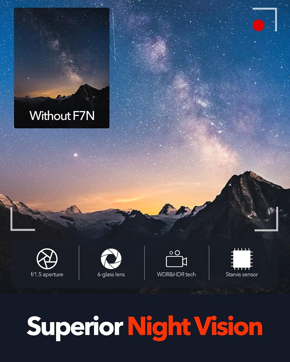 Die F7N nimmt mit einer Frontkamera in gestochen scharfem 4K UHD (3840x2160p) und einer Rückkamera in Full HD (1080p) auf. Zusammen mit dem 170° Weitwinkelobjektiv wird das gesamte Verkehrsgeschehen vor und hinter Ihrem Fahrzeug lückenlos erfasst, sodass wichtige Details wie Nummernschilder klar erkennbar sind.