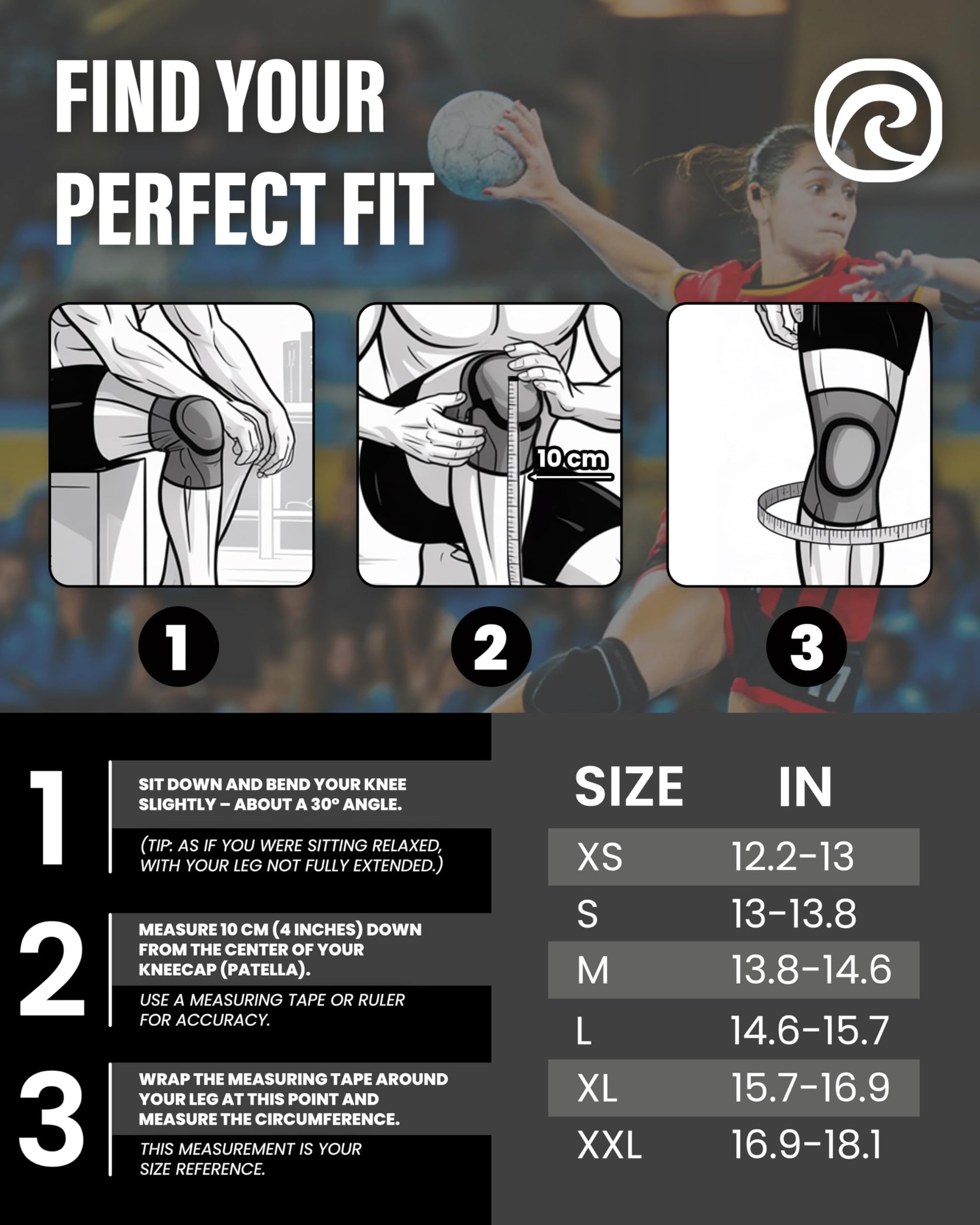 Für die korrekte Grösse messen Sie den Umfang Ihres Beins 10 cm unterhalb der Kniescheibe bei leicht gebeugtem Knie (ca. 30°). Vergleichen Sie diesen Wert anschliessend mit der Grössentabelle des Herstellers, um die optimale Passform zu finden.