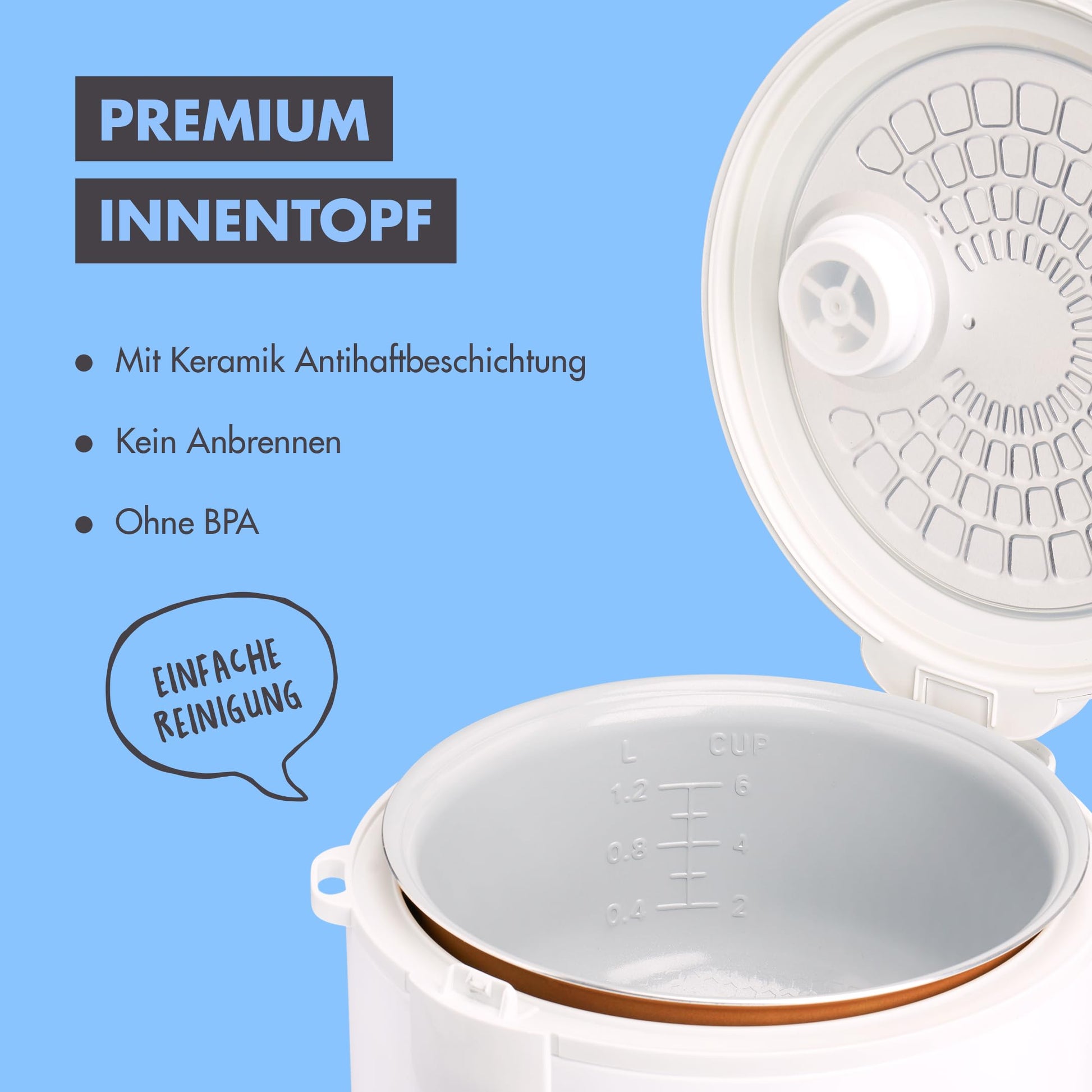 - Hochwertiger Innentopf: Der Topf mit gesundheitlich unbedenklicher Keramikbeschichtung verhindert zuverlässig das Anbrennen und Ankleben von Reis.