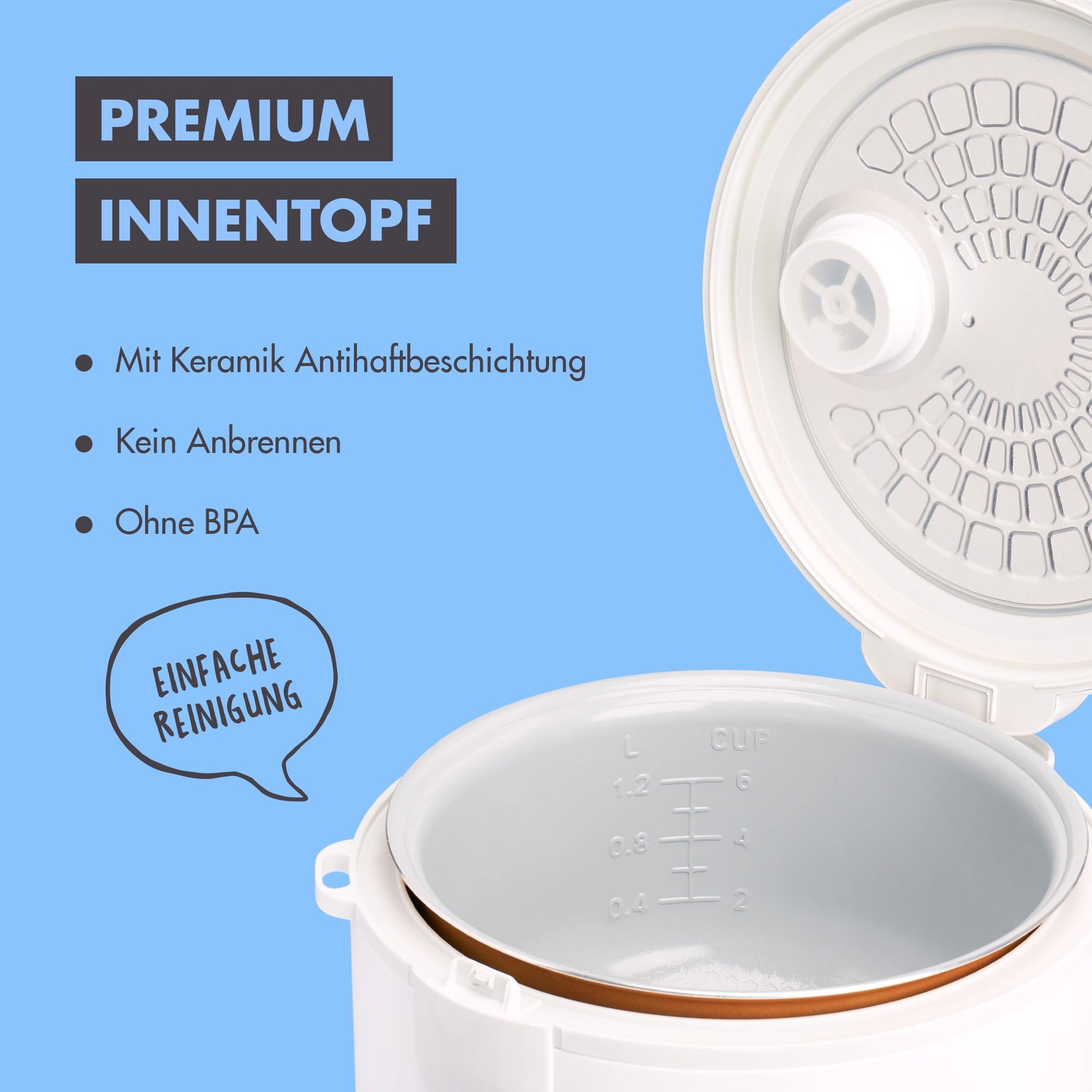 - Fassungsvermögen: 1,2 Liter, ideal für die Zubereitung von 1 bis 6 Portionen Reis.