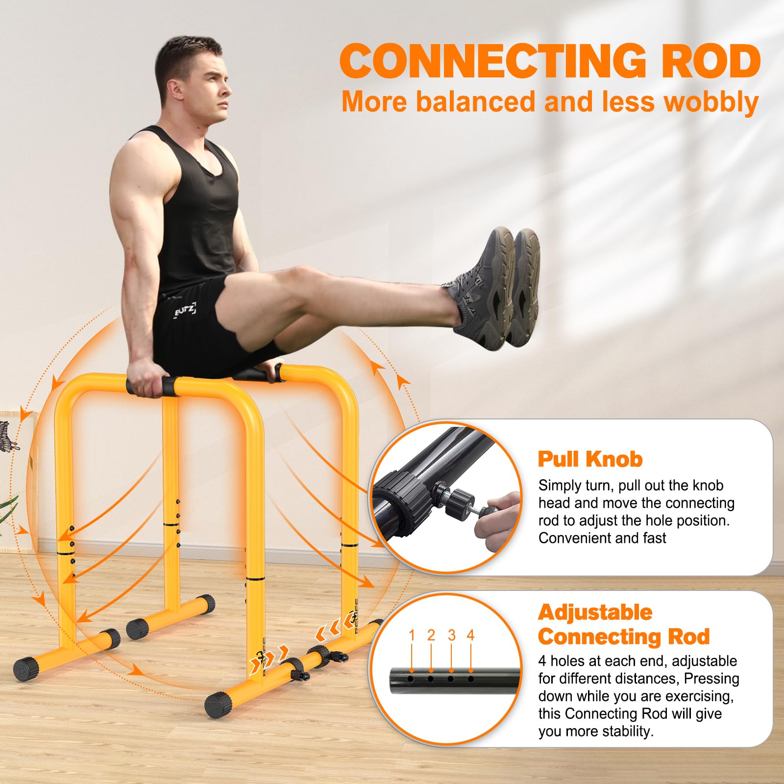 - Sichere Verbindungsstange: Eine seitliche Stange mit vier Einstelllöchern verbindet die beiden Elemente, verhindert ein seitliches Wegkippen und garantiert maximale Sicherheit bei allen Übungen. Die Anpassung erfolgt schnell und werkzeuglos.