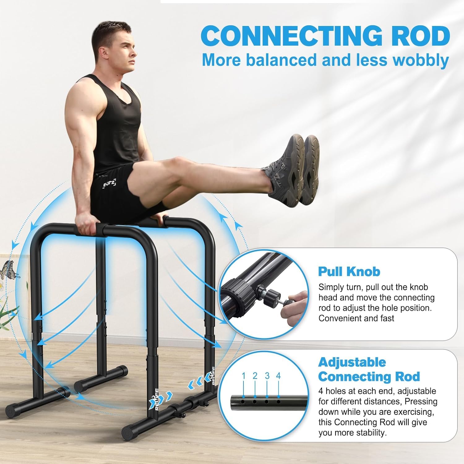 - Sicherheits-Verbindungsstange: Eine seitliche Verbindungsstange, die sich werkzeuglos in der Länge verstellen lässt, verhindert ein seitliches Kippen der Barren und erhöht die Stabilität bei jeder Übung.