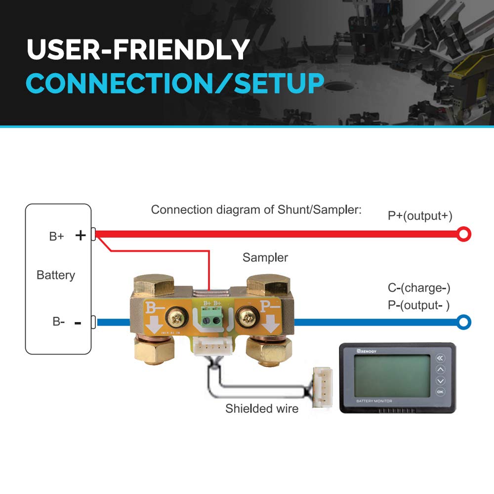 Die Installation ist unkompliziert. Der Mess-Shunt wird in die Minusleitung der Batterie integriert. Dank des mitgelieferten 6 Meter langen, abgeschirmten Kabels können Sie das Display flexibel an einem gut sichtbaren Ort, wie dem Armaturenbrett oder im Wohnbereich, montieren, während die Messung direkt an der Batterie erfolgt.