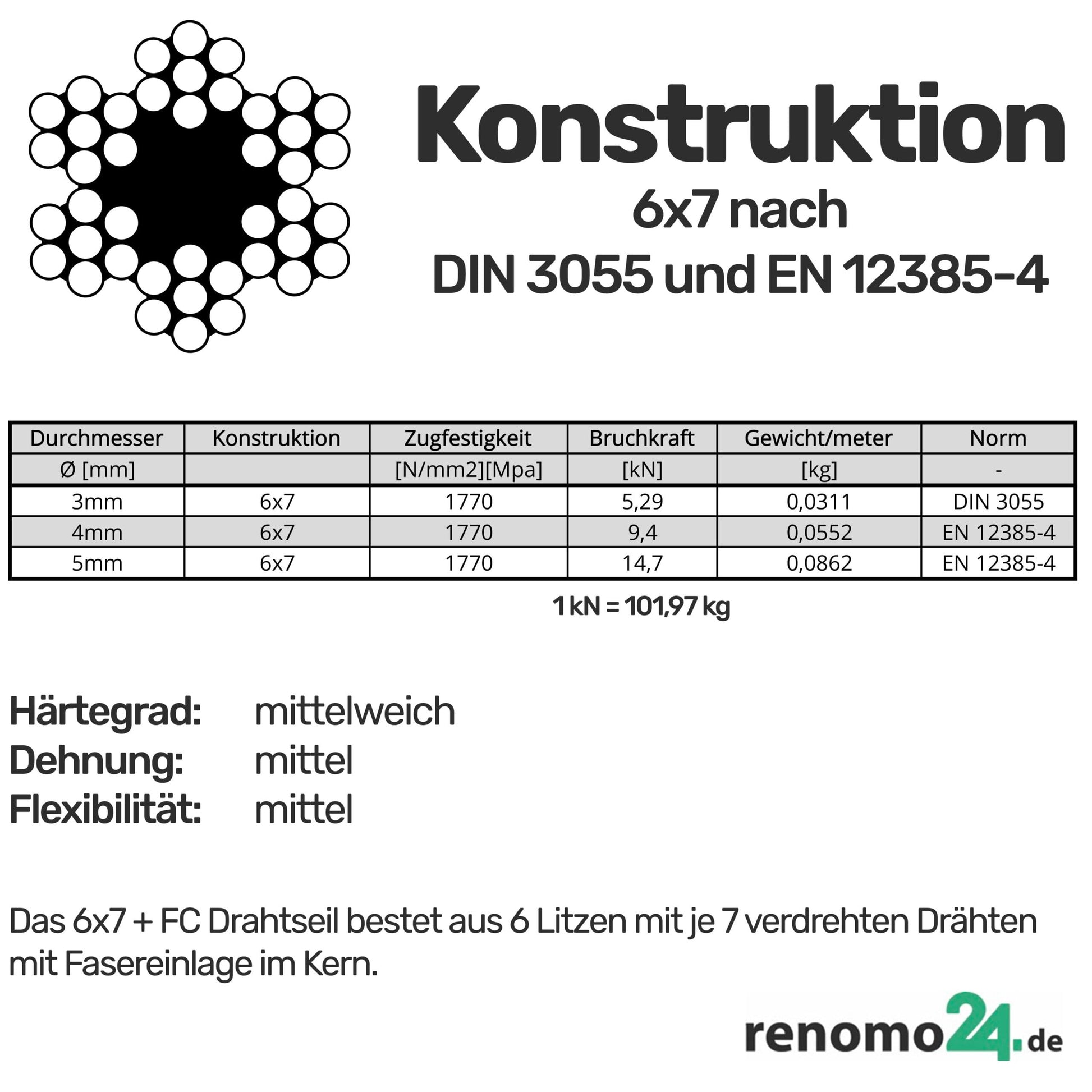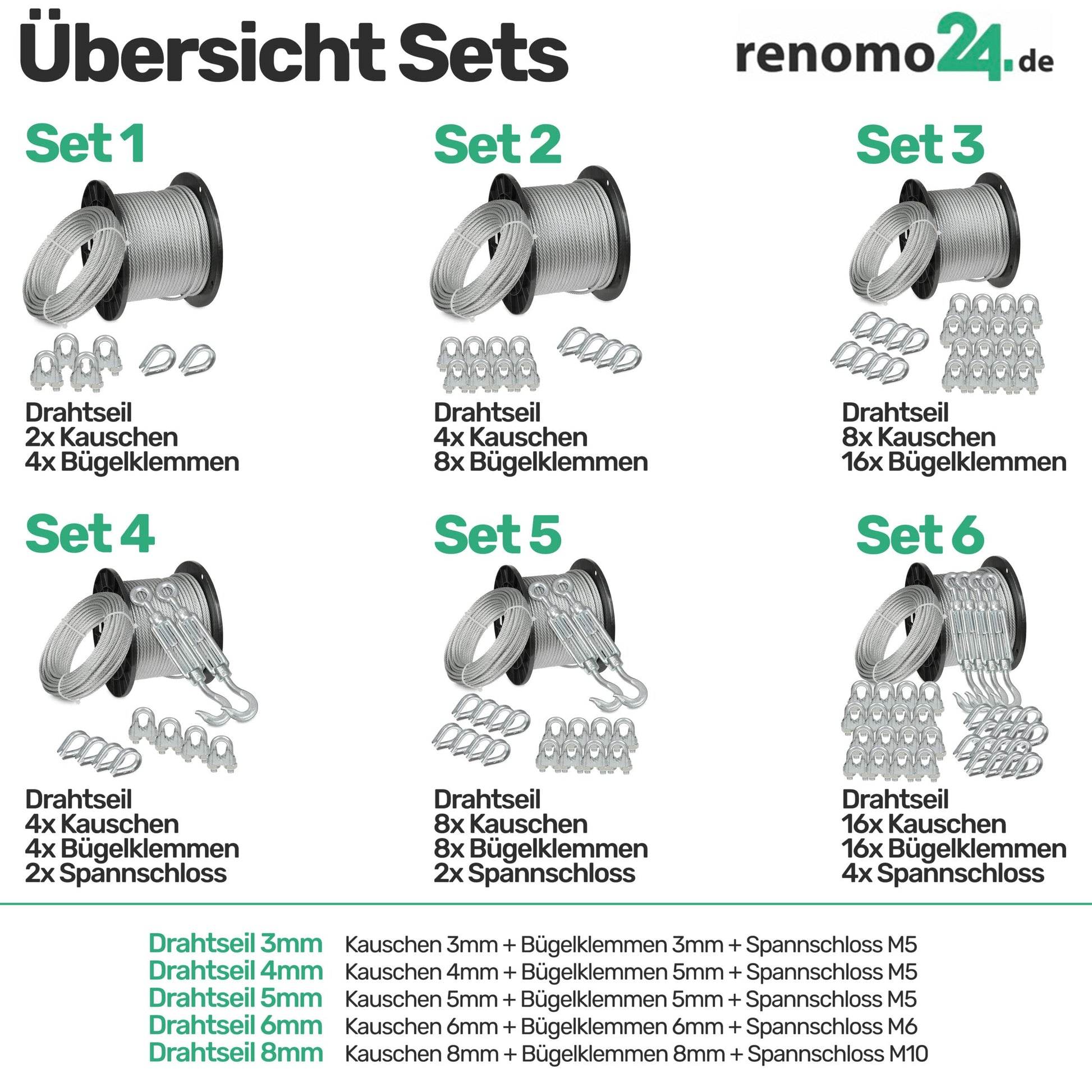Renomo24 Drahtseil Set 6 Stahlseil-Set - 40m 5mm verzinkt