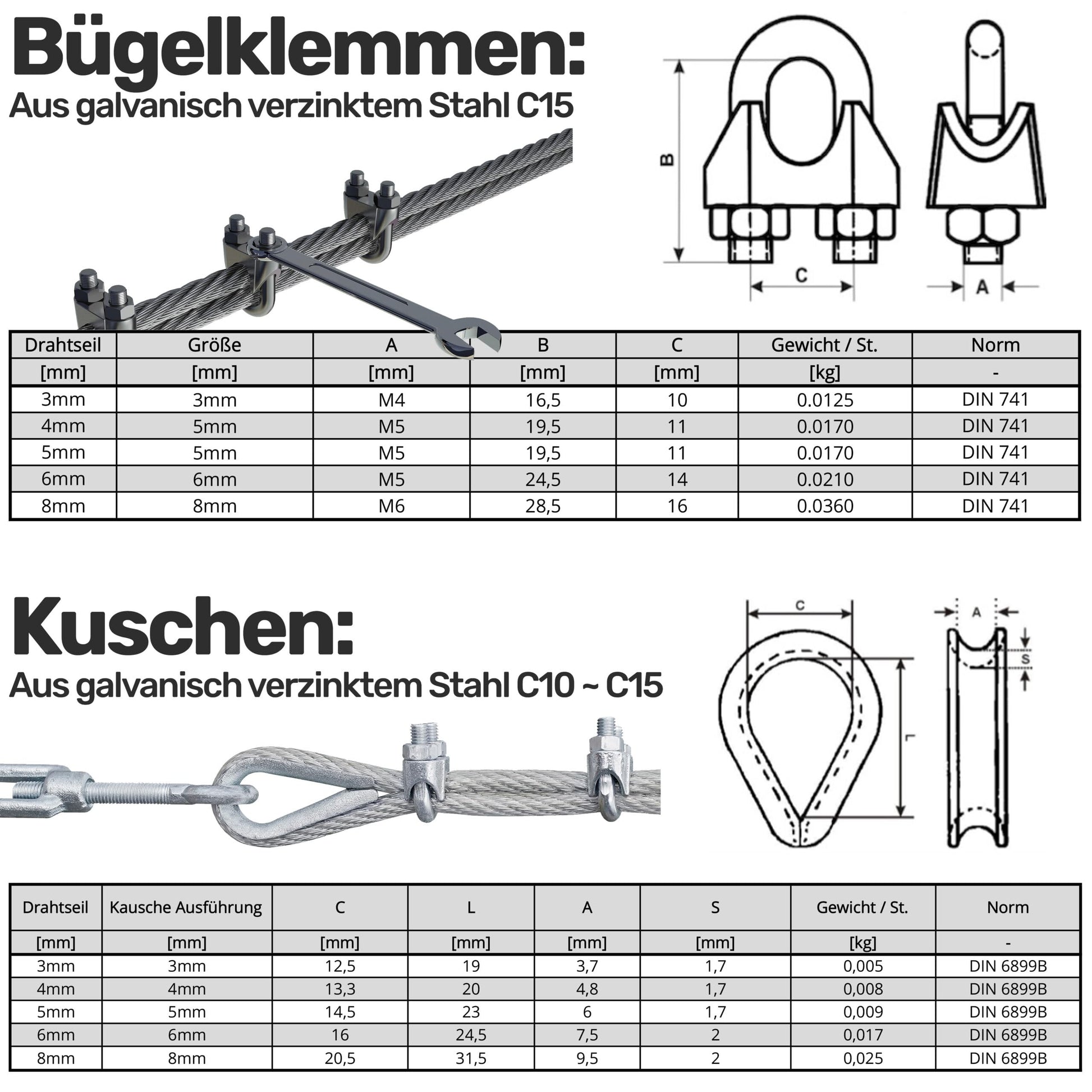 - Langlebiges Zubehör: Alle Komponenten wie Kauschen (nach DIN 6899B), Bügelklemmen (nach DIN 741) und Spannschlösser sind aus galvanisch verzinktem Stahl gefertigt und garantieren hohen Korrosionsschutz und Stabilität.
