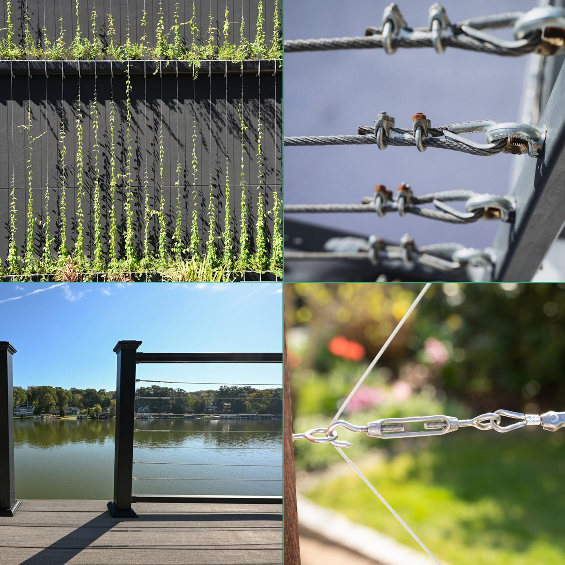 - Komplettes Paket: Beinhaltet 40 Meter verzinktes Stahlseil (5 mm), 4 Spannschlösser (M5, Haken/Öse), 16 Bügelklemmen (5 mm) und 16 passende Kauschen.