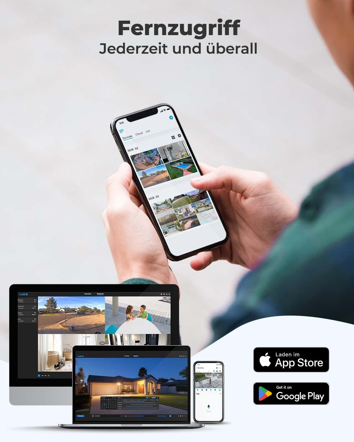 Weltweiter Zugriff und Sicherheit: Bleiben Sie immer informiert, was auf Ihrem Grundstück geschieht. Mit der kostenlosen Reolink App für Smartphones und der Client-Software für Windows & Mac haben Sie jederzeit und von überall sicheren Zugriff auf die Live-Ansicht und die gespeicherten Aufnahmen Ihres Überwachungssystems.