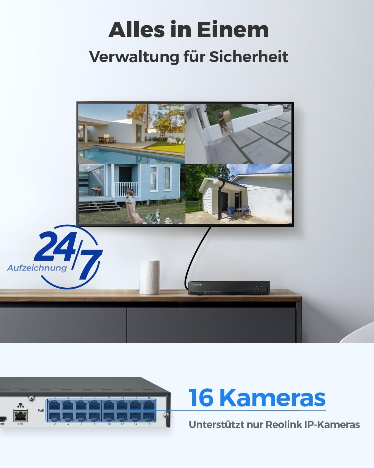 - Flexible Systemerweiterung: Bietet 16 PoE-Ports und ist auf insgesamt 24 Kanäle erweiterbar, um auch Reolink WLAN-Kameras (Plug-in oder akkubetrieben) zu integrieren.