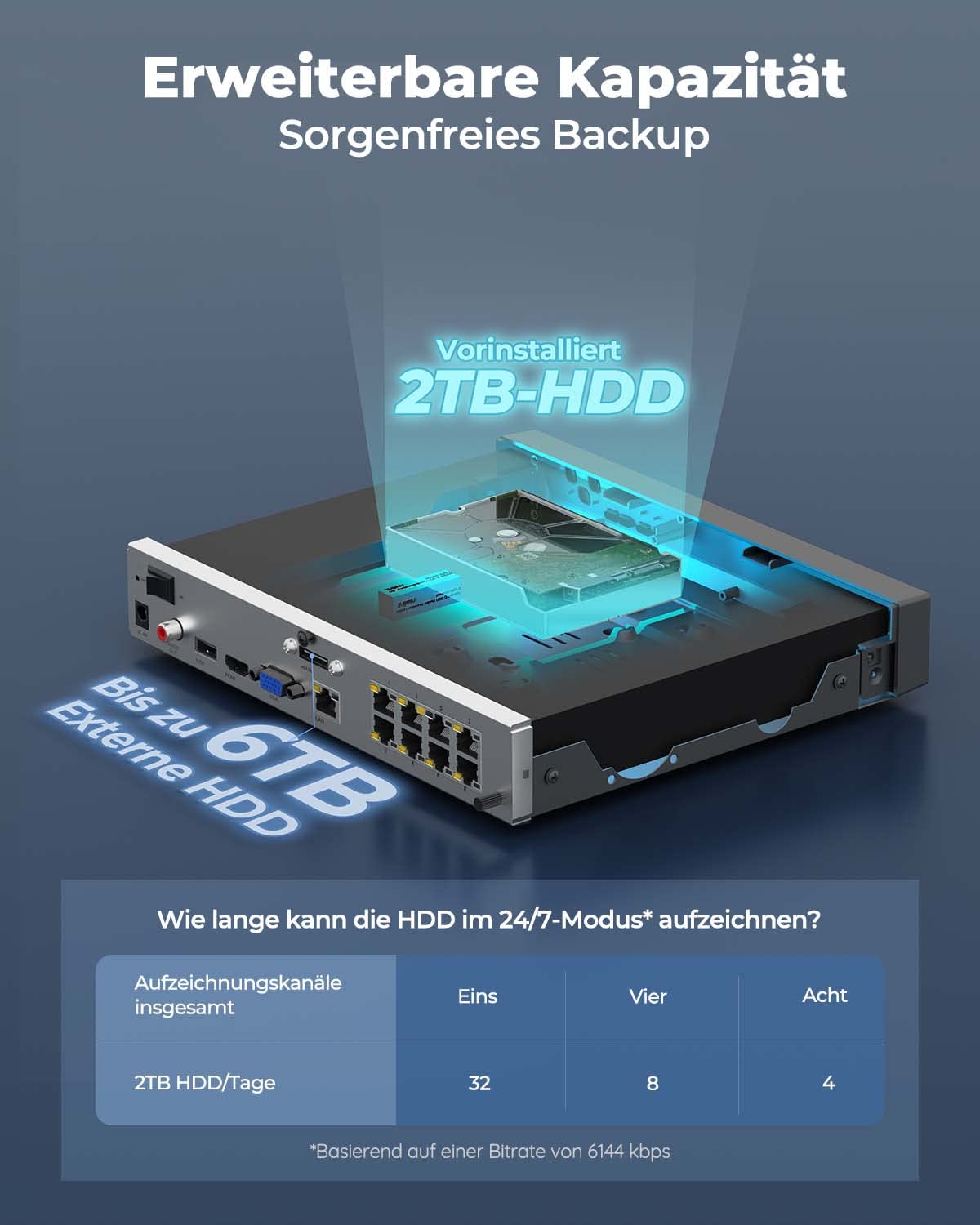 - Flexible Aufzeichnung & Speicher: Eine 2 TB Festplatte ist bereits vorinstalliert. Speichern Sie Aufnahmen rund um die Uhr, nach Zeitplan oder nur bei erkannter Bewegung. Der Speicher ist via e-SATA-Port um eine externe 8-TB-Festplatte erweiterbar.