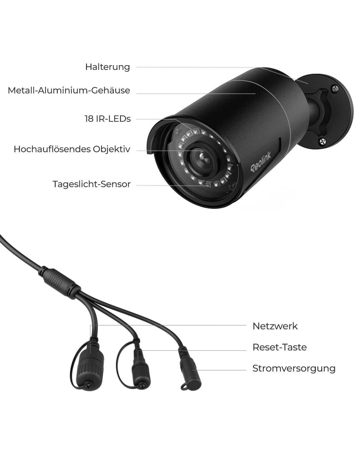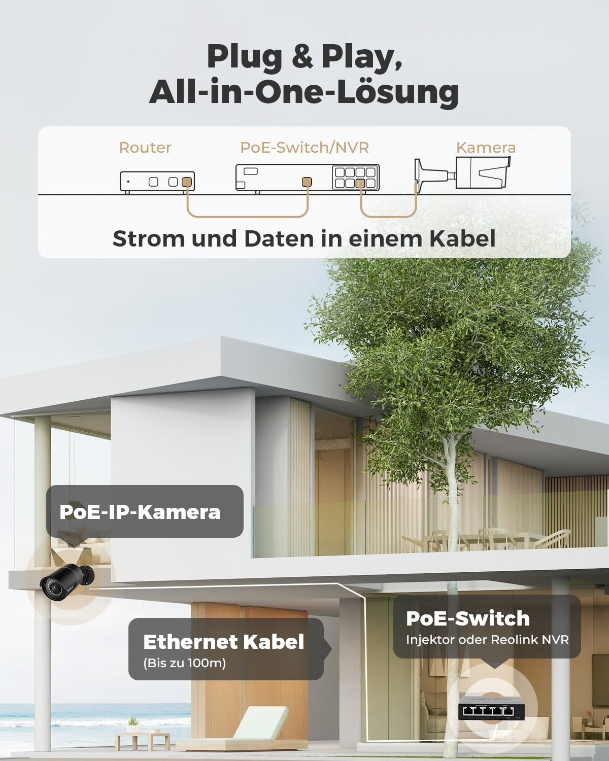 Die Installation ist dank Power over Ethernet (PoE) besonders einfach: Ein einziges Netzwerkkabel genügt für Strom und Datenübertragung. Die Kamera benötigt daher eine stabile, kabelgebundene Verbindung zum Netzwerk und funktioniert nicht über WLAN.