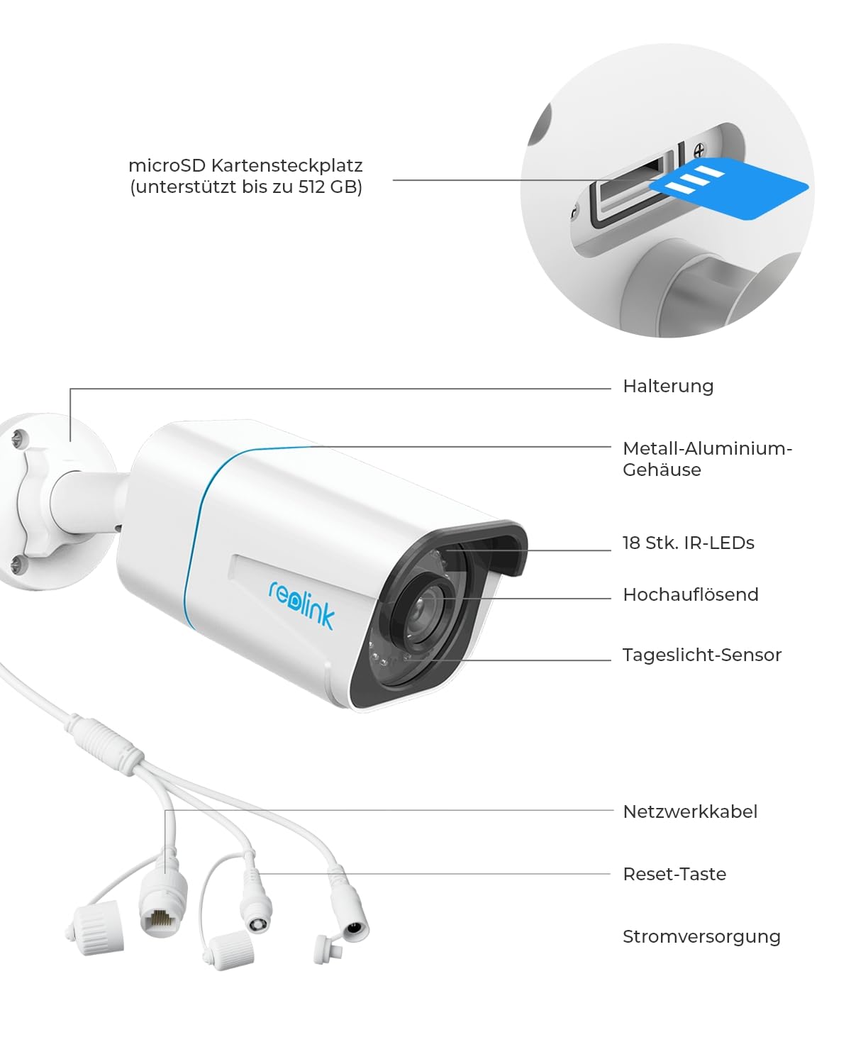 - Flexible Aufzeichnungsoptionen: Speichern Sie Aufnahmen kontinuierlich, zeitgesteuert oder bei Bewegungserkennung direkt auf einer microSD-Karte (bis 512 GB, separat erhältlich). Für eine zentrale Verwaltung mehrerer Kameras kann das System mit einem Reolink NVR erweitert werden.