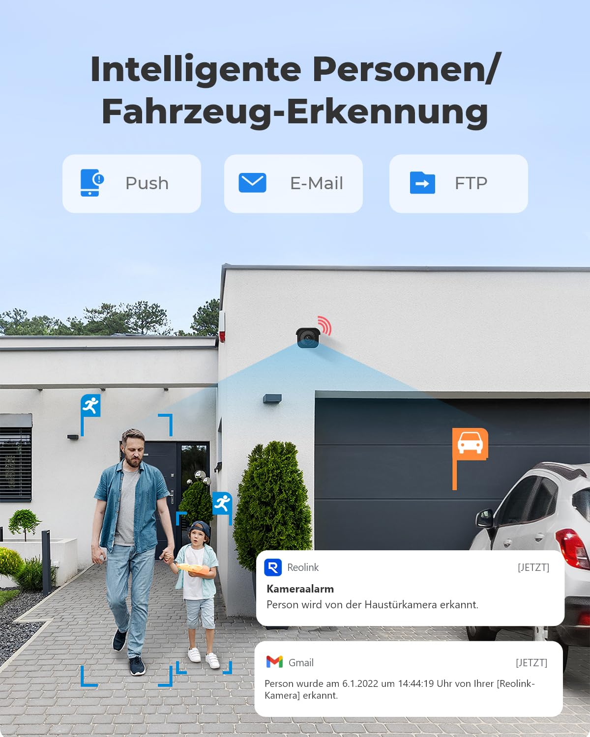 Erhalten Sie nur noch relevante Alarme. Die intelligente Technologie filtert unwichtige Bewegungen heraus und informiert Sie gezielt, wenn eine Person oder ein Fahrzeug Ihr Grundstück betritt. Das erspart Ihnen Zeit und unnötige Unterbrechungen im Alltag.