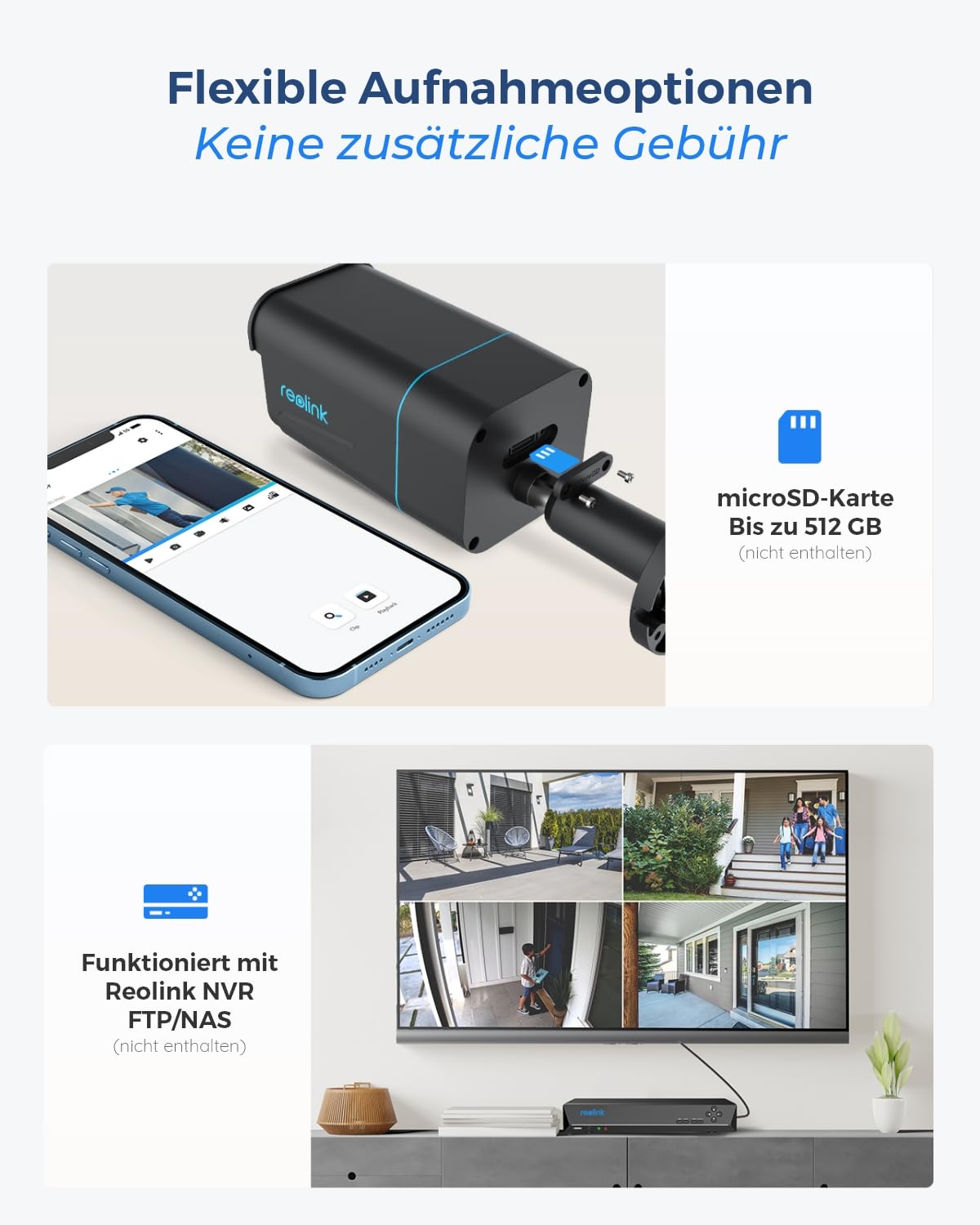 - Flexible Aufnahmeoptionen: Unterstützt Zeitrafferaufnahmen und die Speicherung auf einer microSD-Karte (bis 512 GB, nicht enthalten), einem Reolink NVR oder einem FTP-Server.
