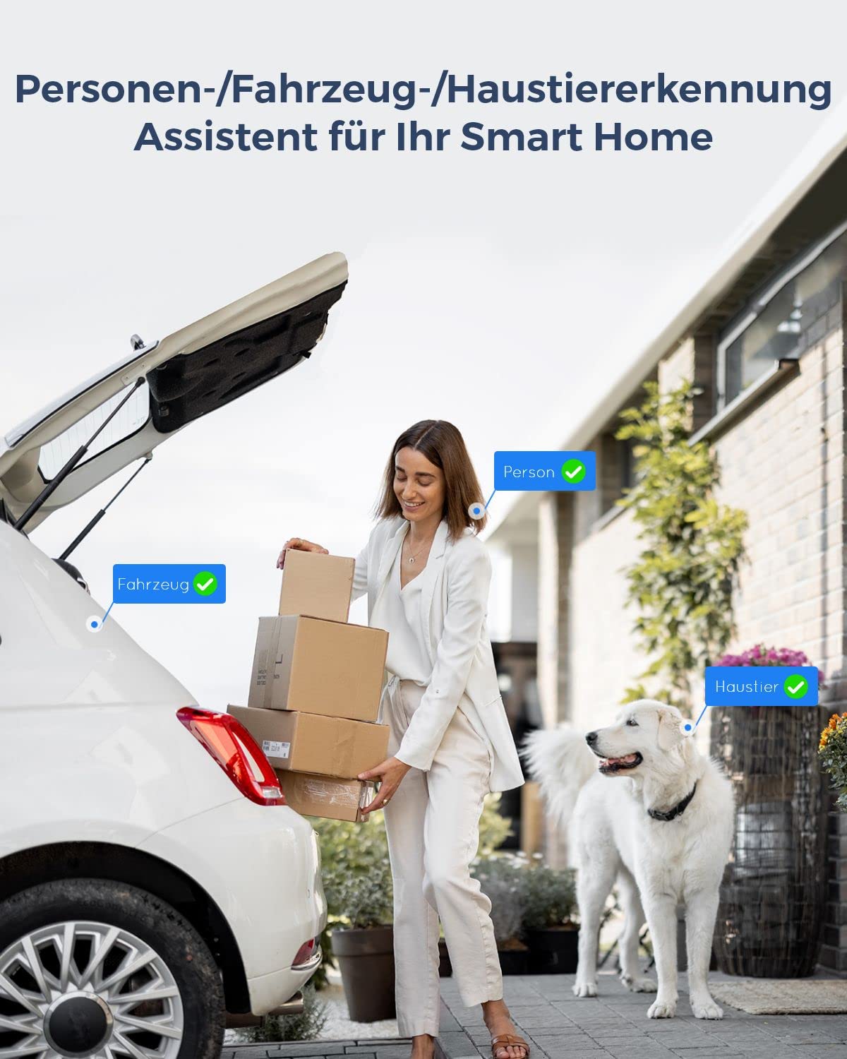 Die Kamera nutzt eine intelligente Personen- und Autoerkennung. Fortschrittliche Algorithmen analysieren Bewegungen und filtern irrelevante Auslöser wie Schatten, Tiere oder fallende Blätter heraus. Sie erhalten somit nur dann eine Benachrichtigung, wenn tatsächlich eine Person oder ein Fahrzeug erkannt wird, was die Anzahl der Fehlalarme drastisch minimiert.