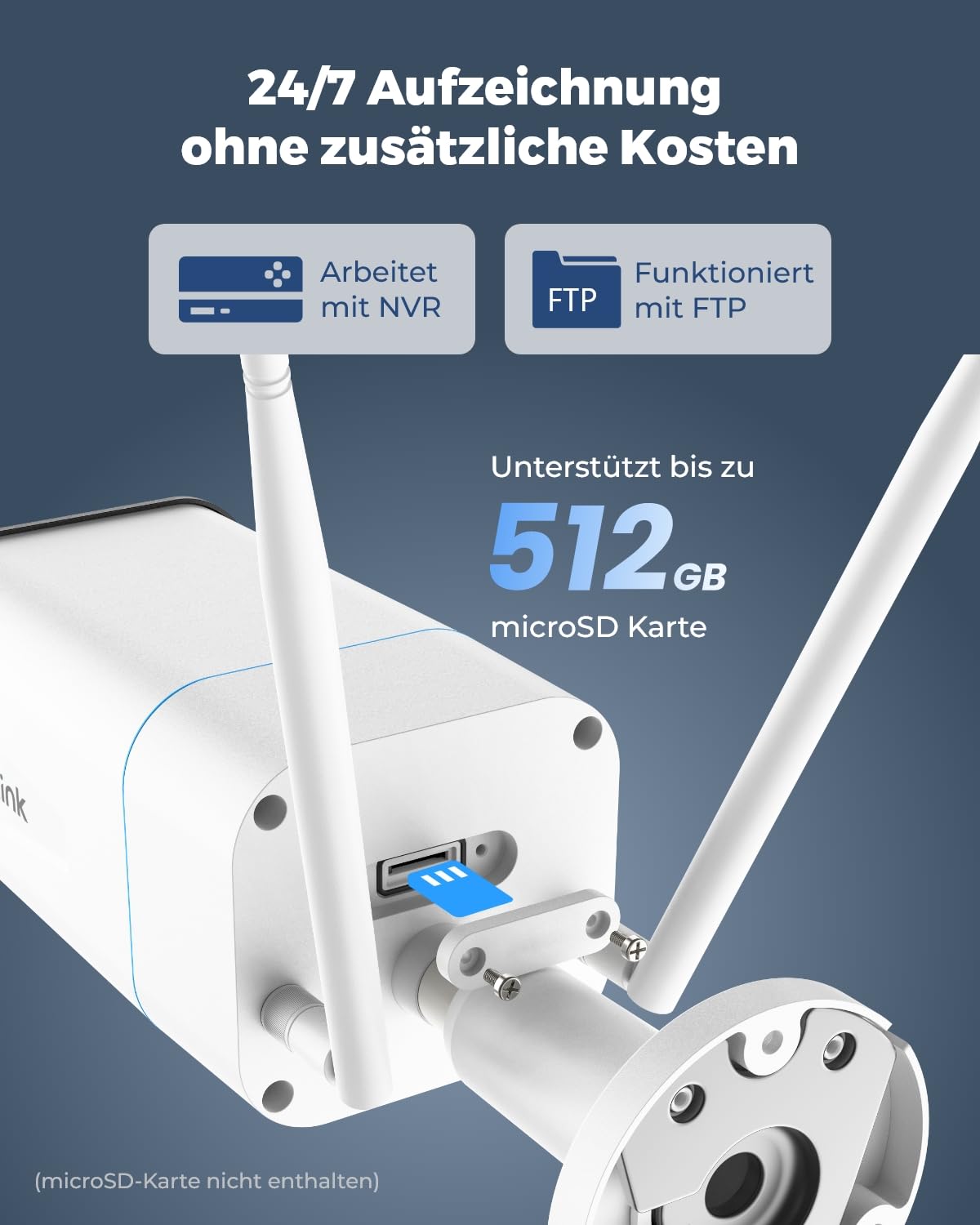 - Speicherung: Flexible, lokale Speicheroptionen auf microSD-Karte, Reolink NVR oder FTP-Server.