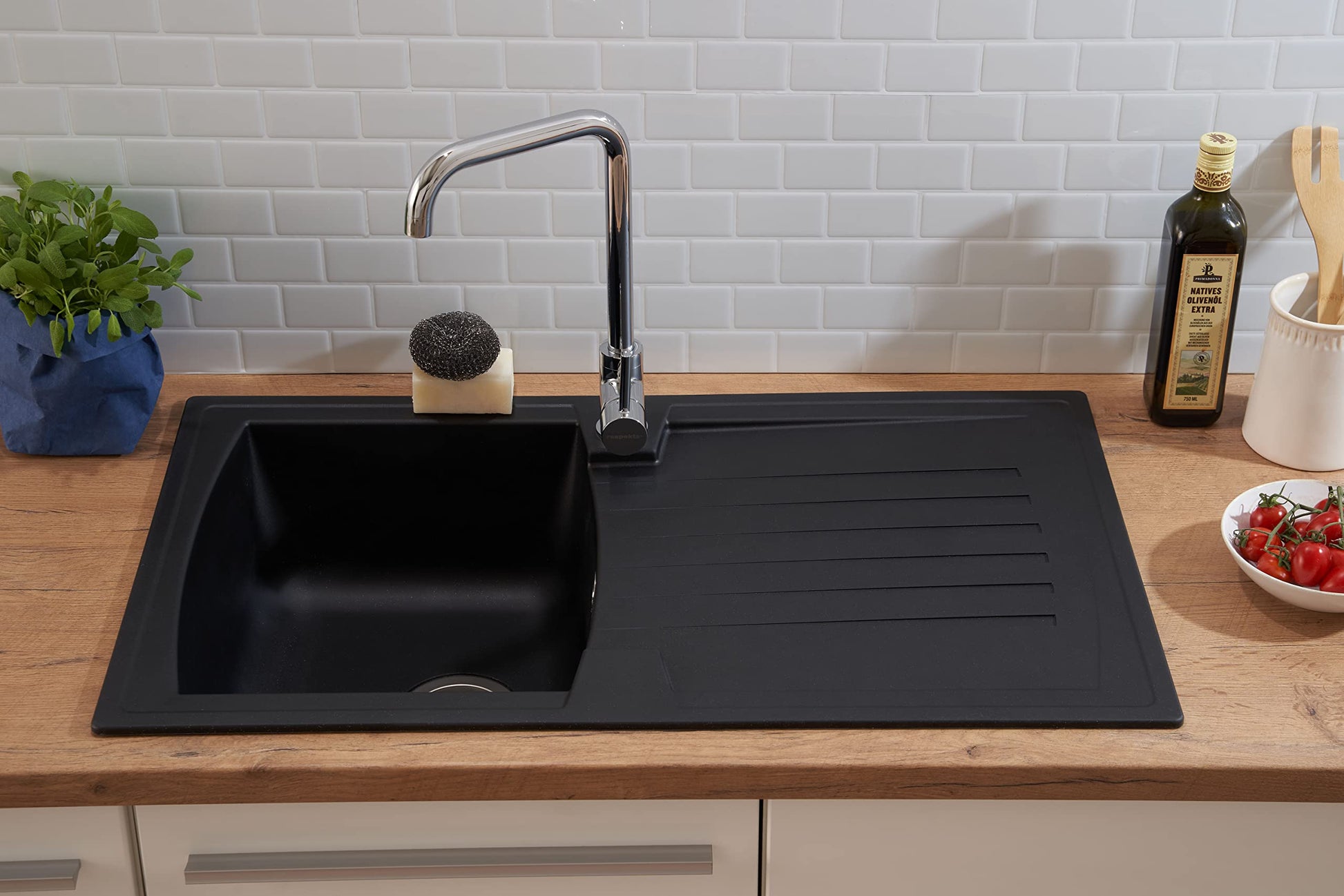 Das tiefe Becken erleichtert den Abwasch von sperrigem Geschirr, während die klare Linienführung und die schwarze Farbe sich nahtlos in moderne Küchendesigns einfügen. Diese Spüle ist die perfekte Wahl für alle, die Wert auf Qualität, Ästhetik und hohe Alltagstauglichkeit legen.