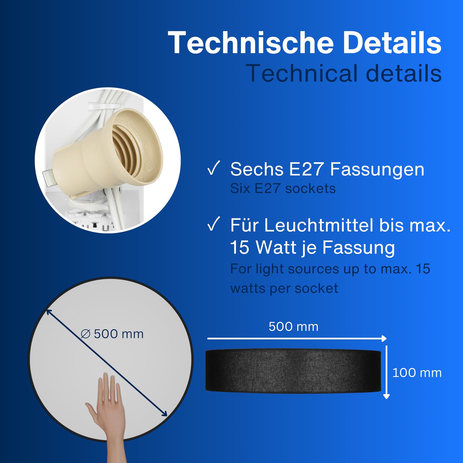 - Maximale Leistung: 15 Watt pro Fassung