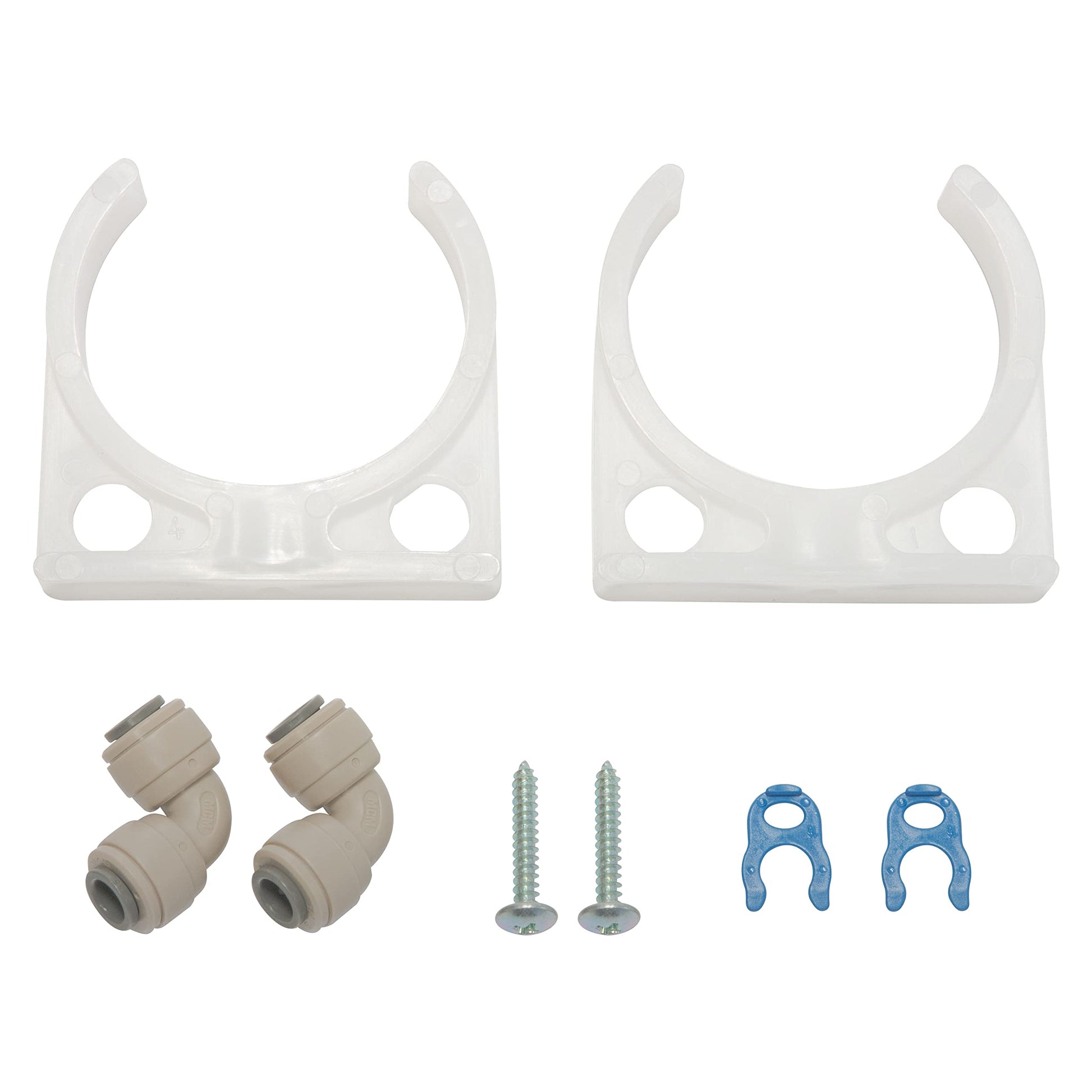 Das Set enthält alles für zwei Filterwechsel: 2x RF-M6 Wasserfilter, 4x Winkelkupplungen (Quick Connect), 4x Halterungen mit passenden Dübeln und Schrauben sowie 4x Sicherungsringe. Bitte beachten Sie, dass der für den Anschluss benötigte 1/4 Zoll Kunststoffschlauch nicht Teil des Lieferumfangs ist.