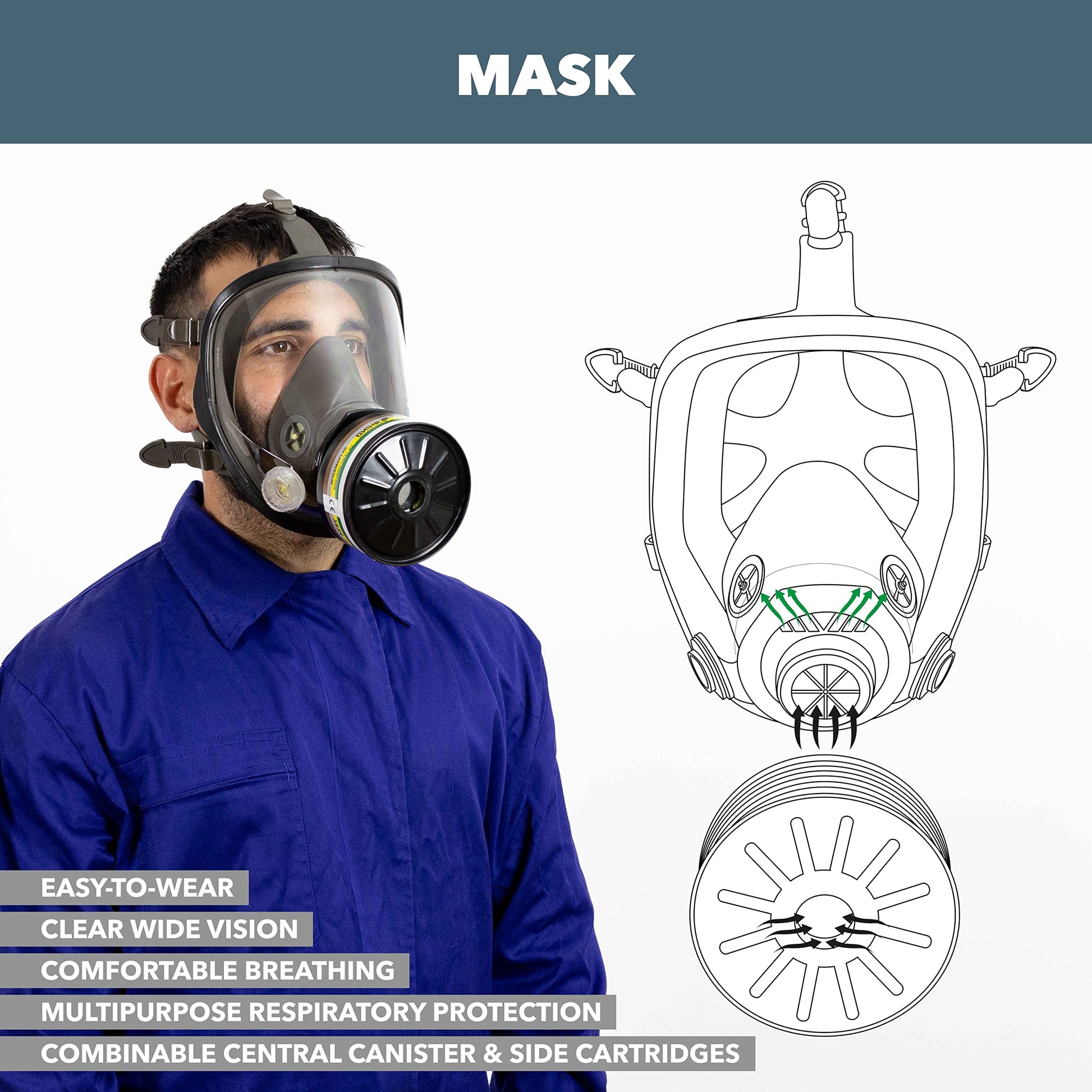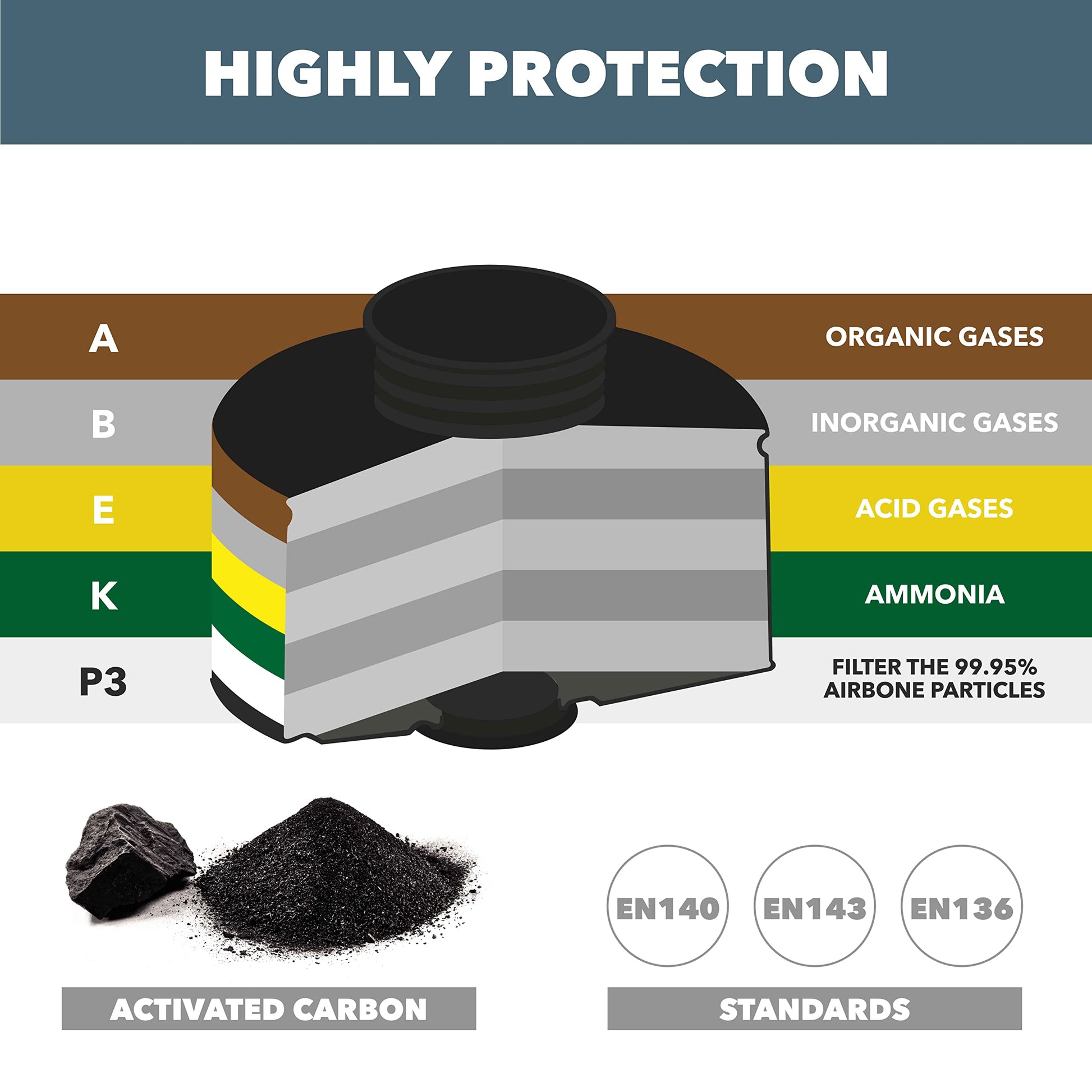 - Höchste Schutzklasse ABEK2P3R: Der mitgelieferte Filter schützt zuverlässig vor organischen und anorganischen Dämpfen, sauren Gasen, Ammoniak sowie festen und flüssigen Partikeln.