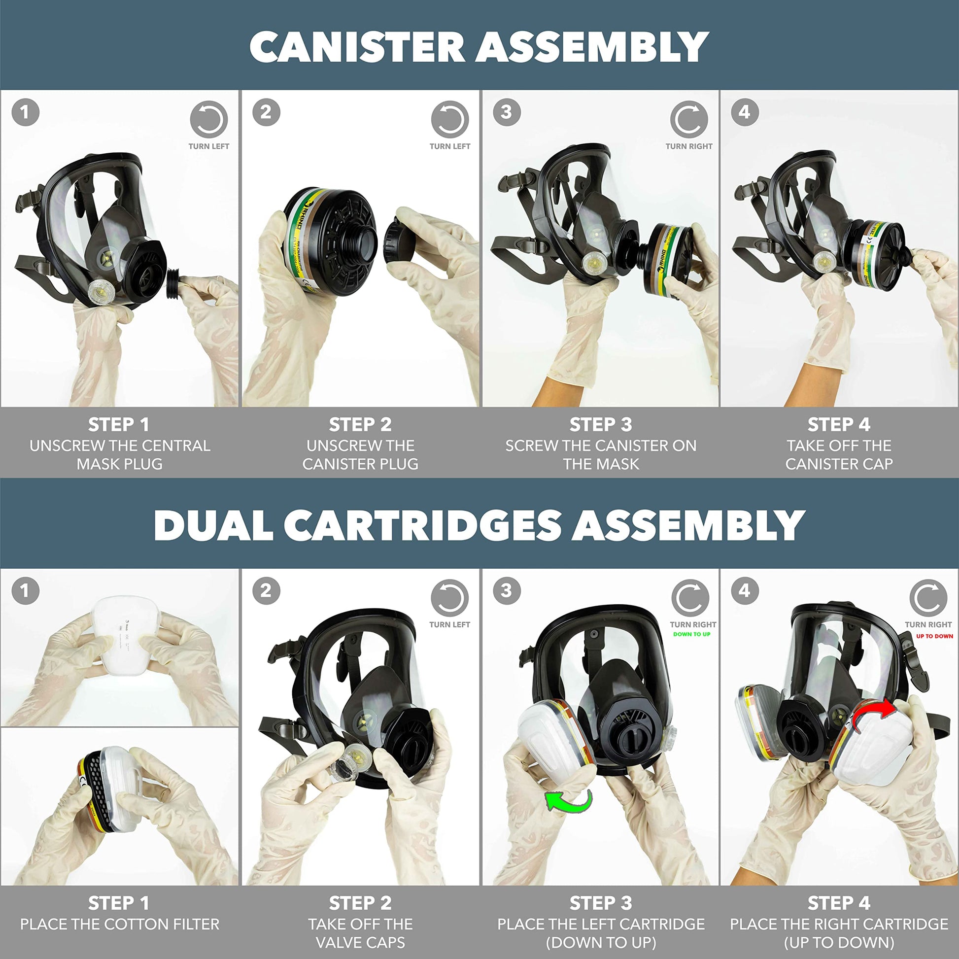 Das Komplett-Set der RHINO RH-7011B enthält alles für den sofortigen Einsatz: den Maskenkörper, eine Hochleistungs-Messingkartusche mit ABEK2P3R Filter, zwei Paar Handschuhe sowie eine detaillierte Bedienungsanleitung.