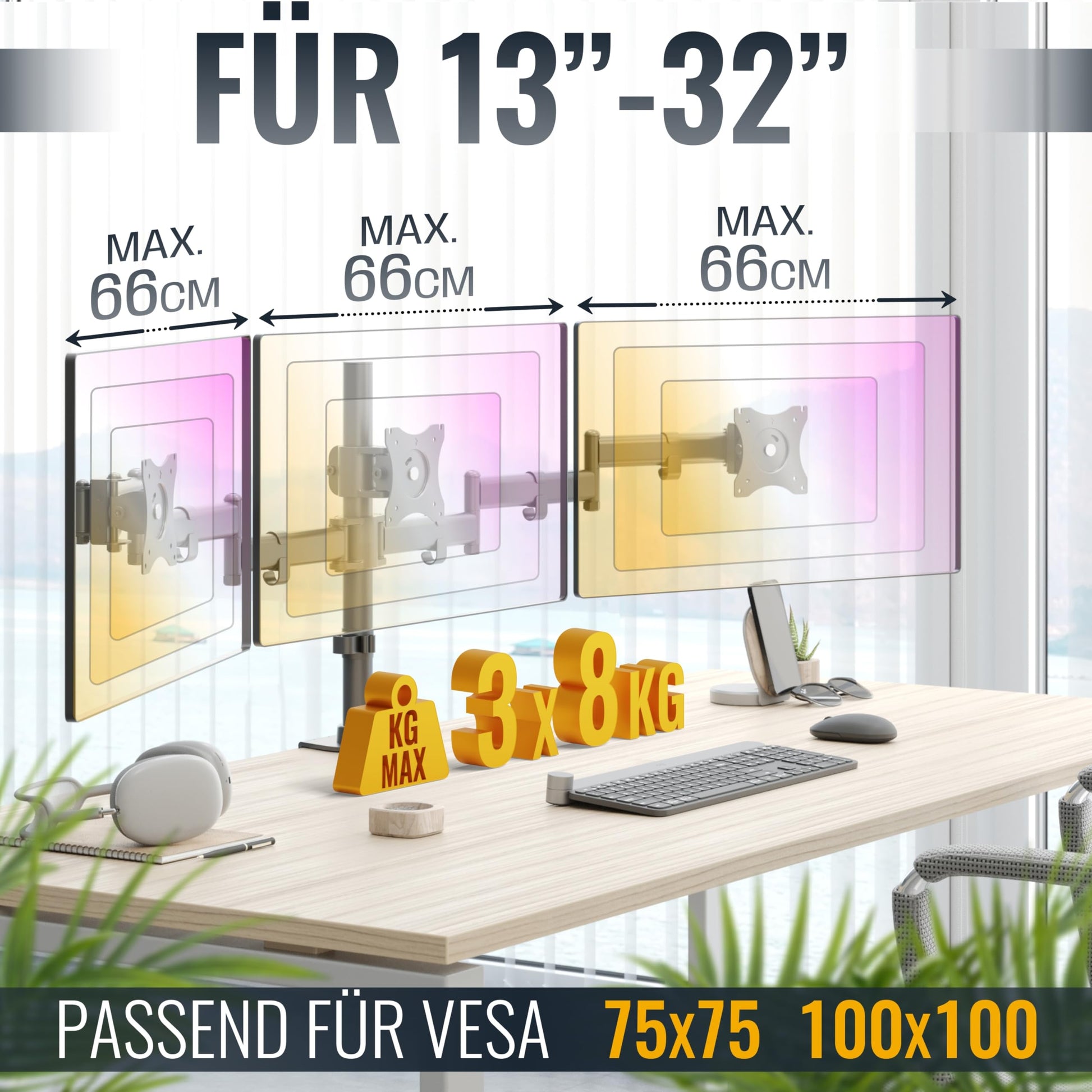 Diese Halterung ist für die meisten Monitore von 13 bis 32 Zoll geeignet. Entscheidend sind drei Kriterien: Ihr Monitor darf pro Stück nicht mehr als 8 kg wiegen, muss über eine VESA-Aufnahme von 75x75 mm oder 100x100 mm verfügen und darf eine maximale Breite von 660 mm nicht überschreiten. Auch Curved-Monitore können montiert werden, sofern diese Bedingungen erfüllt sind.