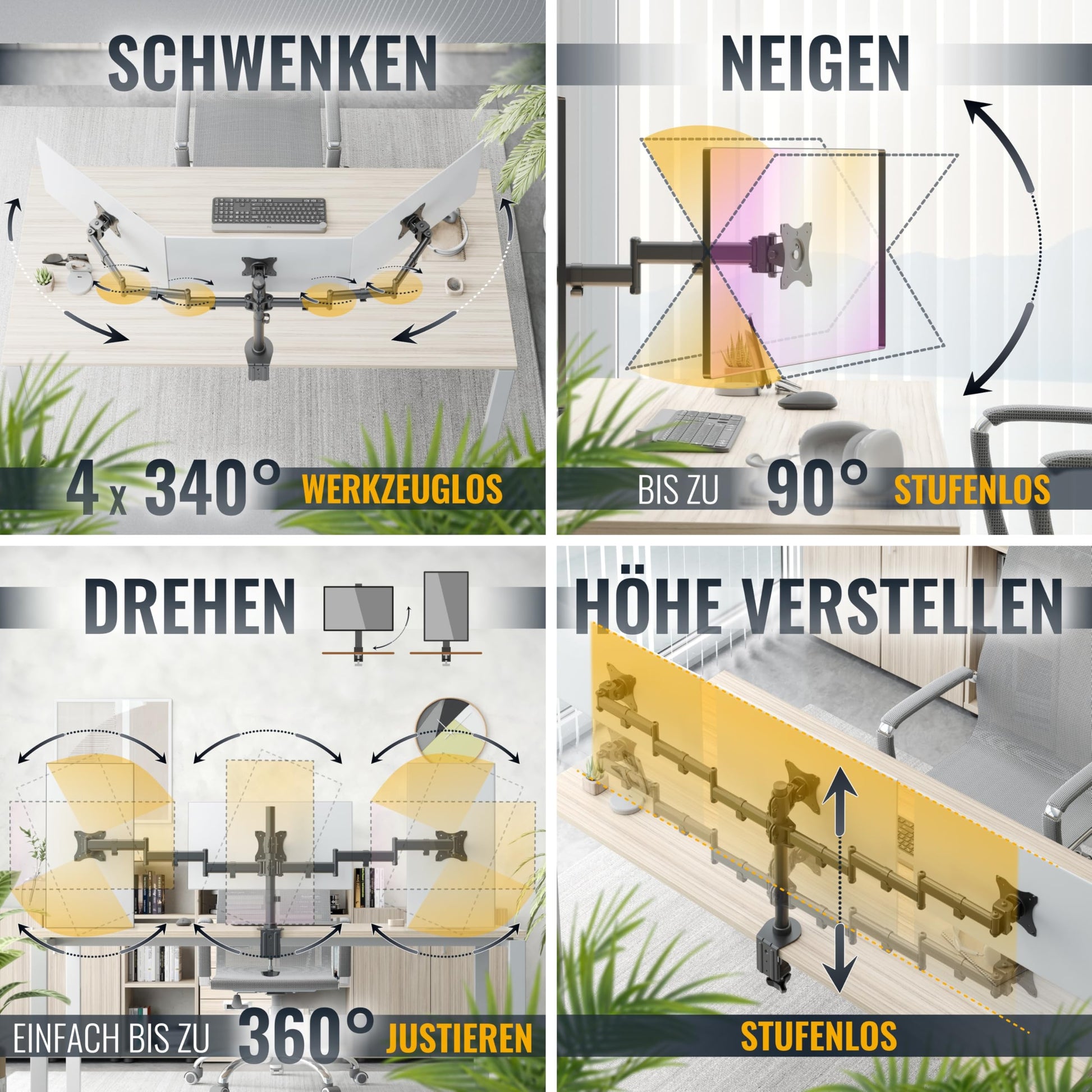 Schaffen Sie mit dieser stabilen Tischhalterung eine produktive und aufgeräumte Arbeitsumgebung für bis zu drei Monitore. Sie ermöglicht eine flexible Ausrichtung Ihrer Bildschirme und sorgt für mehr Platz auf dem Schreibtisch.