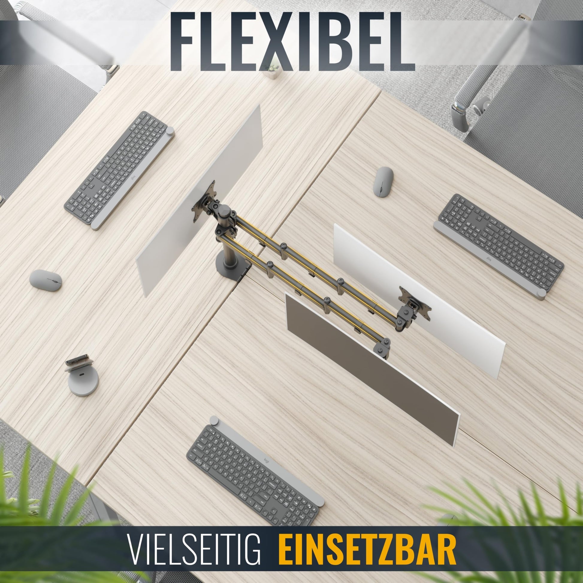 Gewinnen Sie wertvollen Platz auf Ihrer Arbeitsfläche zurück. Ob im Home-Office oder für Ihre Gaming-Station, diese Halterung lässt Ihre Monitore über dem Tisch schweben und sorgt für eine saubere, professionelle Optik. Die umfassenden Einstellungsmöglichkeiten erlauben eine perfekte Ausrichtung der Bildschirme, was Nackenverspannungen vorbeugt und den Arbeitskomfort erhöht.