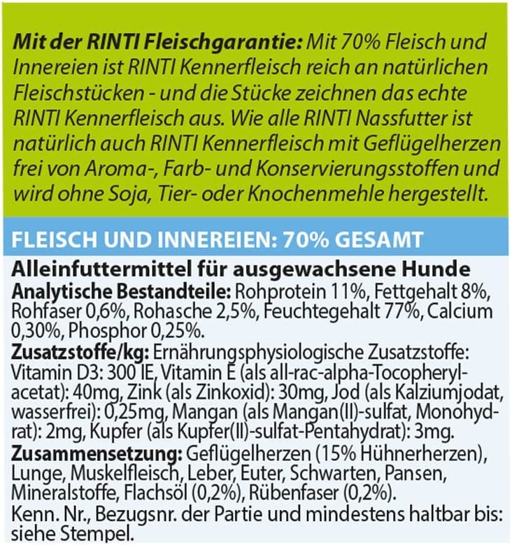 Rinti Kennerfleisch verwendet ausschliesslich echte, saftige Fleischstücke und verzichtet bewusst auf Formfleisch. Die Rezeptur besteht zu 70% aus bestem Fleisch und nahrhaften Innereien, was für eine besonders schmackhafte und artgerechte Mahlzeit sorgt.
