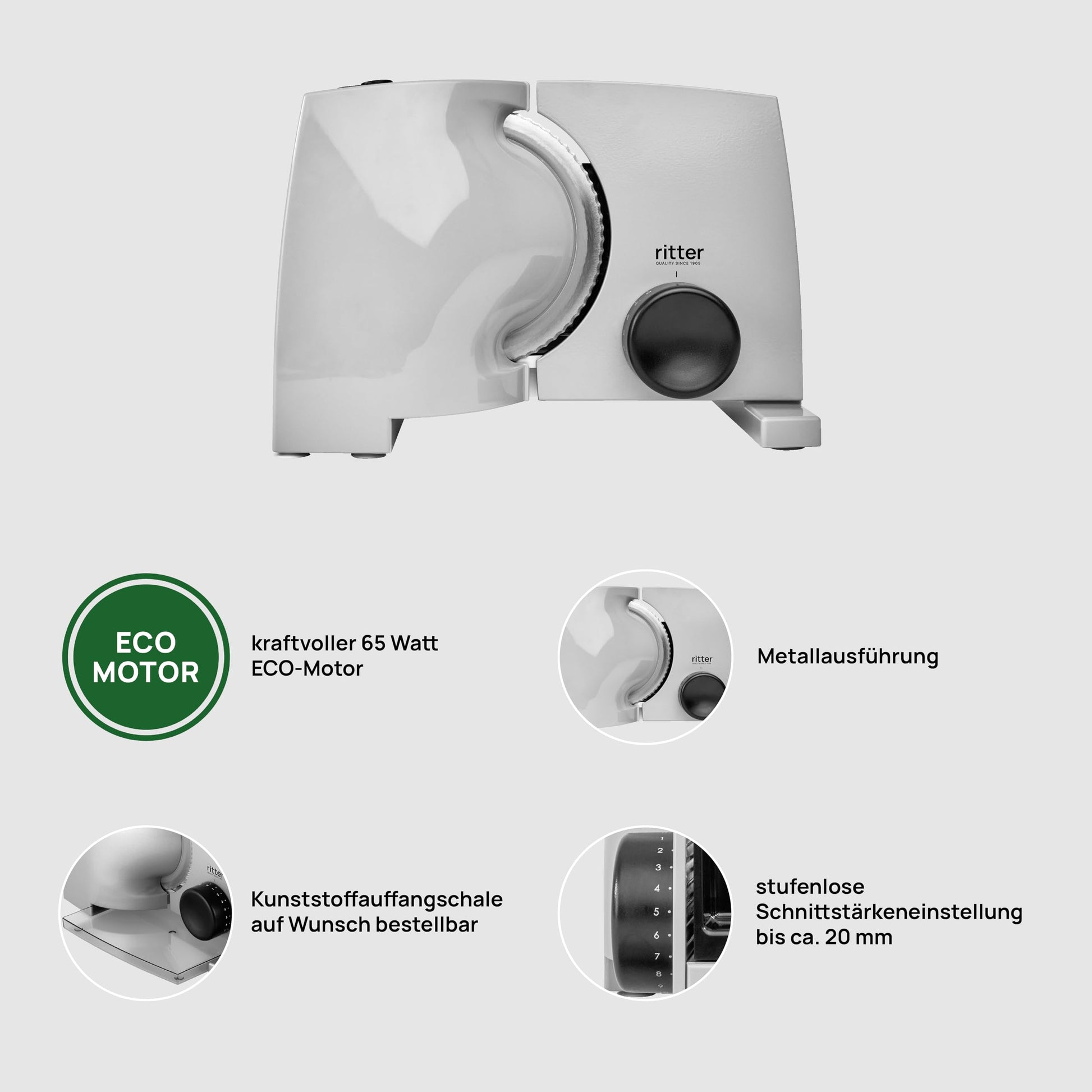 - Stufenlose Schnittstärkenverstellung: Ermöglicht exakte Schnitte, von papierdünn bis zu einer Dicke von ca. 20 mm.