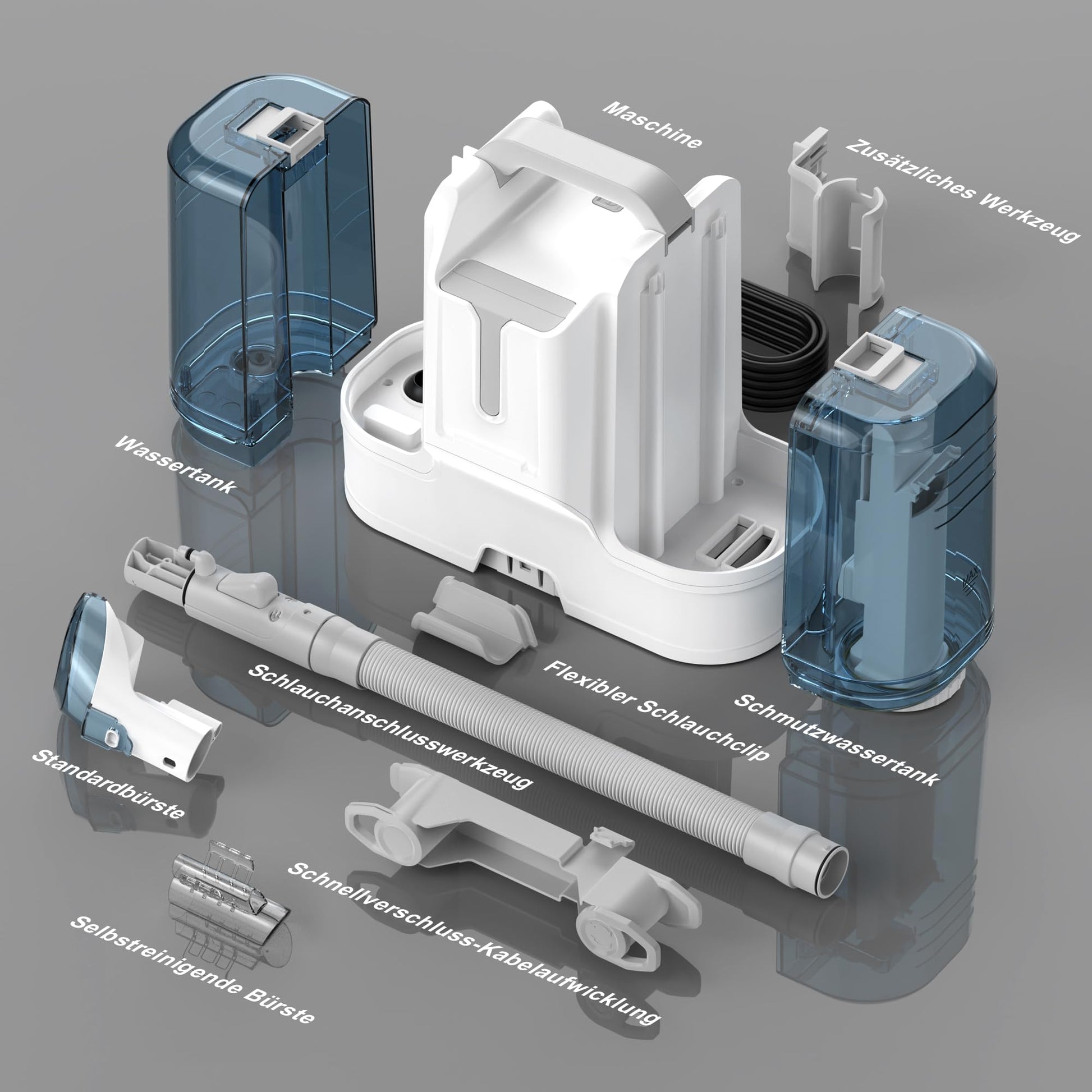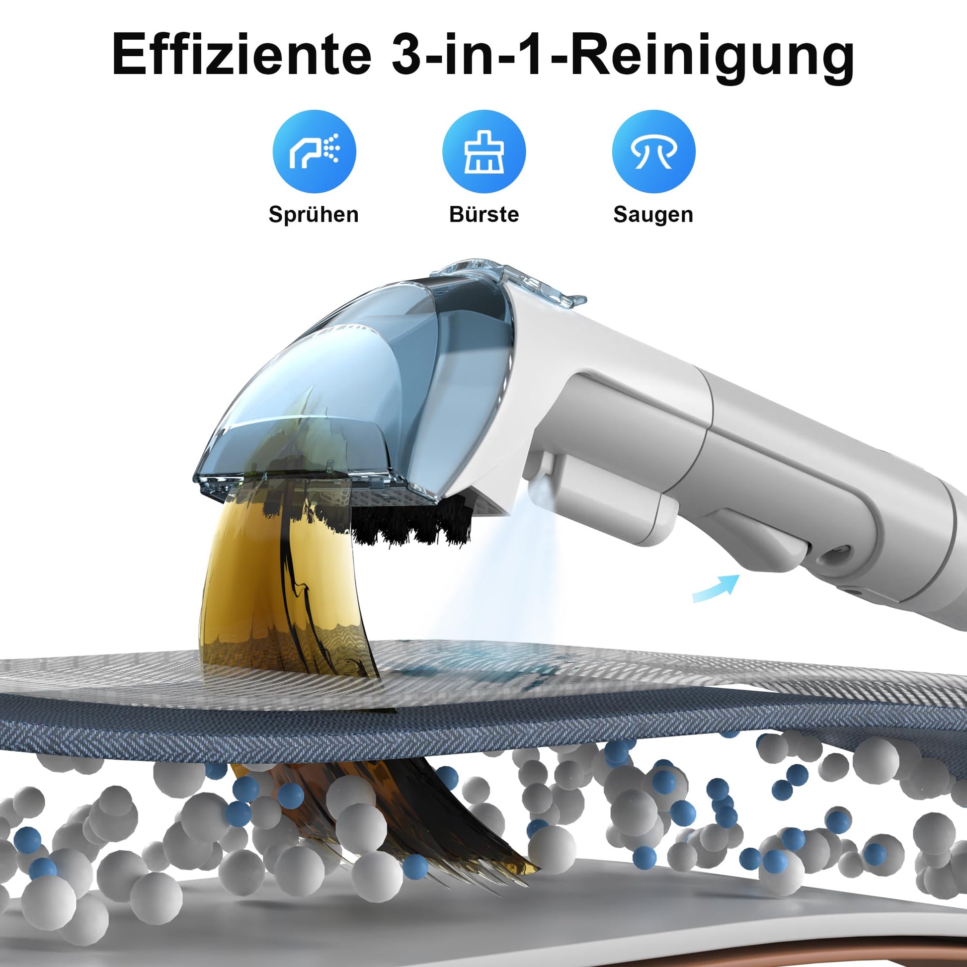 - 3-in-1-Reinigungssystem: Das Gerät vereint die Funktionen Sprühen, Bürsten und Saugen in einem Arbeitsgang, um eine maximale Reinigungseffizienz zu gewährleisten.