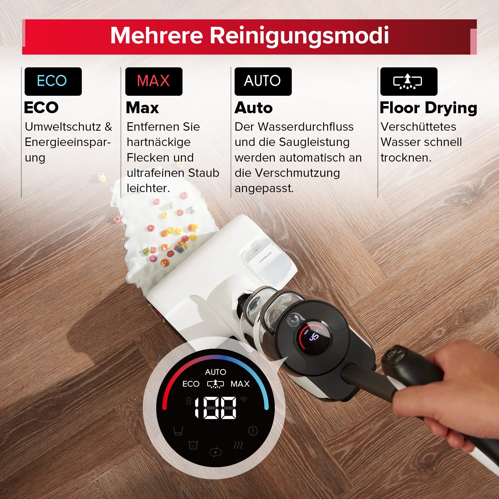 - Vier Reinigungsmodi: Wählen Sie je nach Bedarf zwischen den Modi AUTO, MAX, ECO und BODENTROCKNUNG. Praktische Sprachansagen informieren Sie über den aktuellen Status.