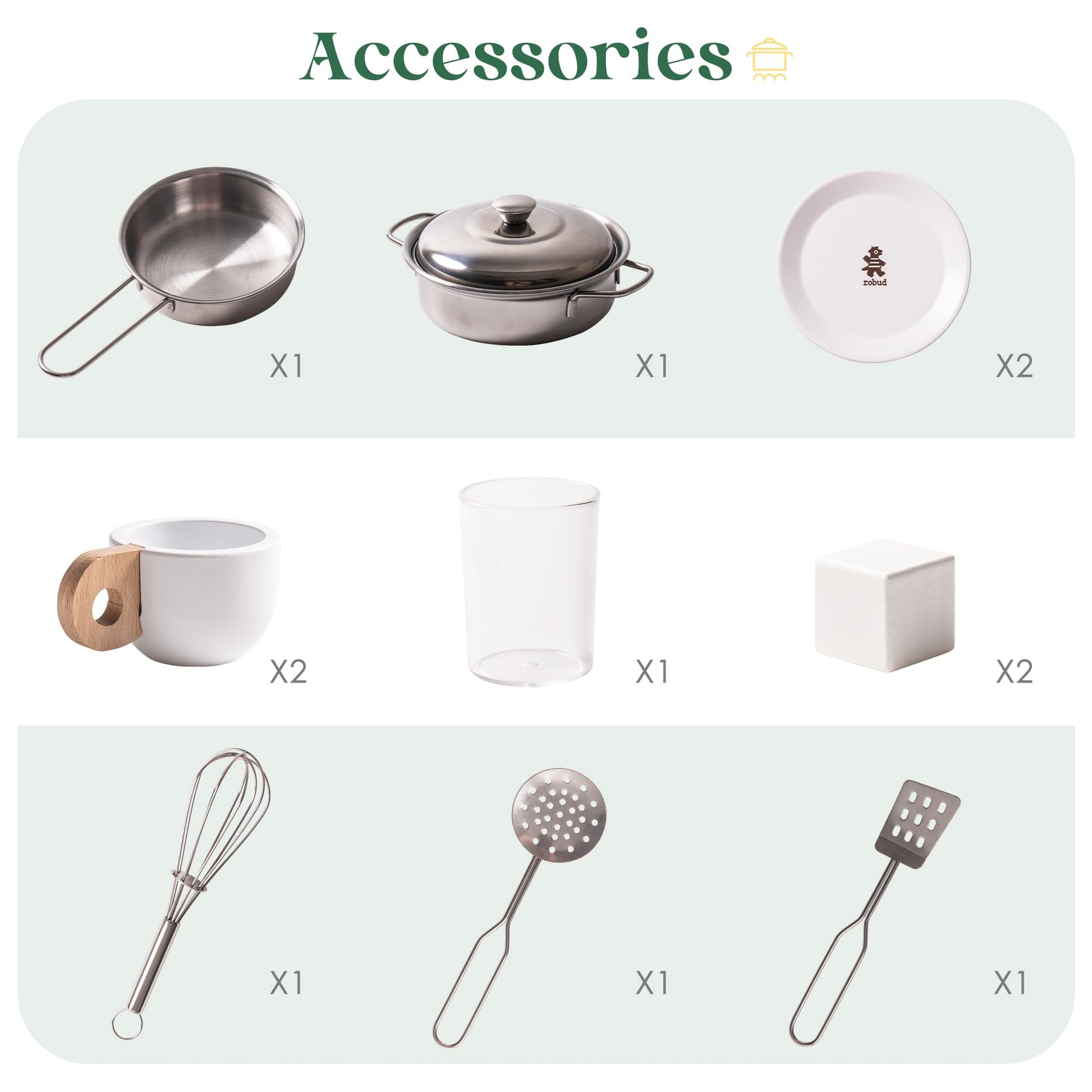 - Vielseitiges Zubehör: Im Lieferumfang ist bereits ein komplettes Set an Küchenutensilien enthalten, darunter ein Schaumlöffel, ein Spatel, ein Rührbesen, zwei Töpfe, Teller, Tassen und Eiswürfel.