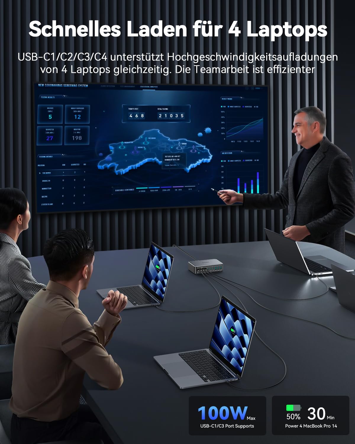 Ja, absolut. Die Station ist speziell dafür ausgelegt und kann bis zu vier Laptops simultan versorgen. Die USB-C-Anschlüsse C1 bis C4 sind für diese hohe Leistung optimiert, wobei C1 und C3 sogar parallel jeweils bis zu 100W liefern können – genug, um zwei MacBook Pro 14" in nur 25 Minuten auf 50% zu laden.
