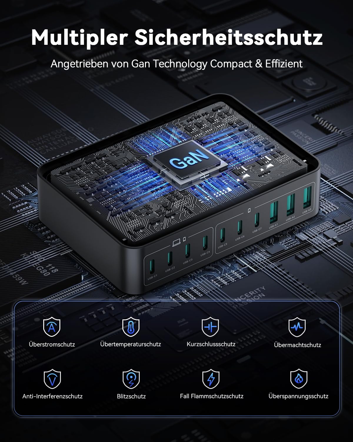 GaN (Galliumnitrid) ist ein modernes Halbleitermaterial, das eine höhere Energieeffizienz bei geringerer Wärmeentwicklung ermöglicht. Dadurch kann die Ladestation trotz ihrer immensen 480W Gesamtleistung erstaunlich kompakt (12 x 8,5 x 3 cm), leicht (420g) und im Betrieb effizient gekühlt bleiben.