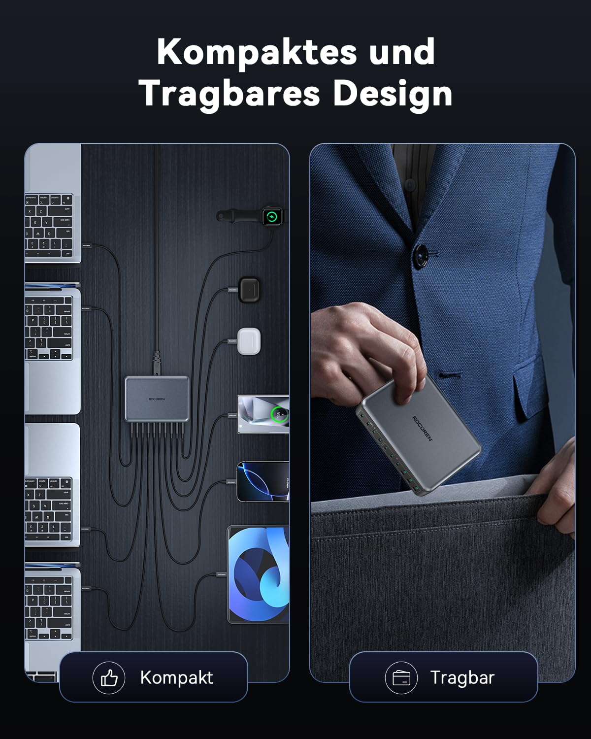 Dank der fortschrittlichen GaN-Technologie bleibt die Ladestation erstaunlich handlich und leicht. Sie ist der perfekte Begleiter für Geschäftsreisen oder den mobilen Arbeitsplatz. Das mitgelieferte 1,5-Meter-Kabel gibt Ihnen dabei die nötige Flexibilität, um Ihre Geräte bequem an jedem Ort zu positionieren und aufzuladen.