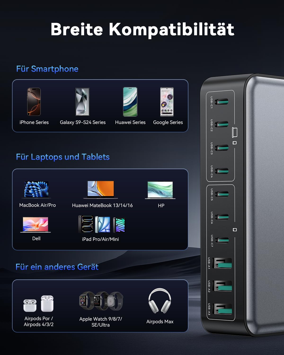 - Multi-Laptop-fähig: Die vier Haupt-USB-C-Anschlüsse (C1-C4) sind darauf ausgelegt, bis zu vier Laptops gleichzeitig aufzuladen.