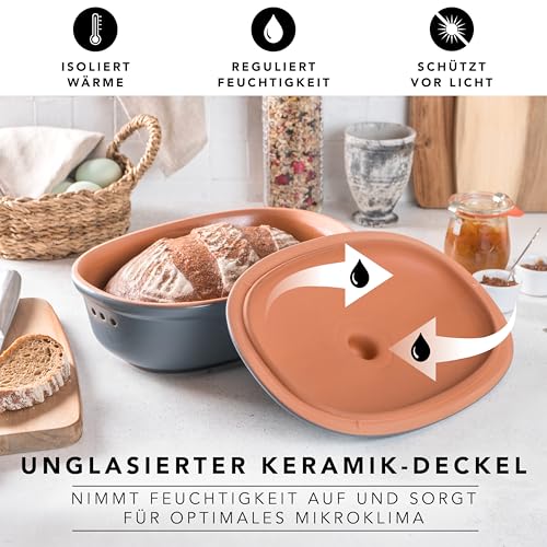 Der Brottopf funktioniert wie eine natürliche Klimaanlage. Der spezielle, atmungsaktive Naturton, sechs Belüftungslöcher und der unglasierte Deckel schaffen ein perfektes Klima. Der Deckel nimmt überschüssige Feuchtigkeit auf, während die Luftzirkulation Schimmelbildung verhindert und das Brot gleichzeitig vor dem Austrocknen schützt.