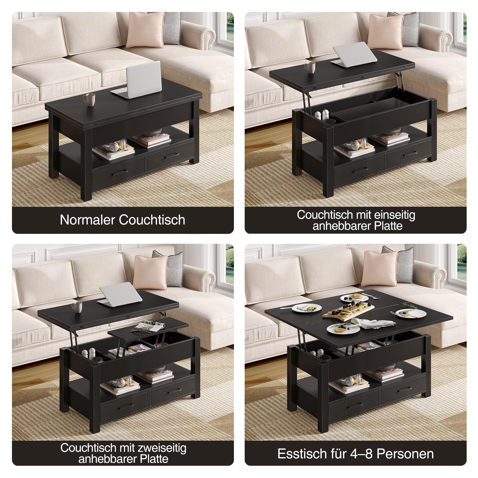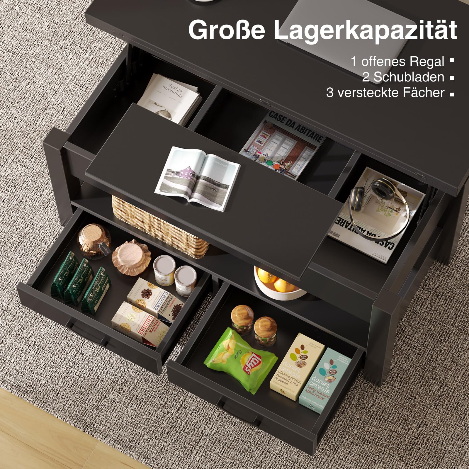 Der Tisch ist ein wahres Stauraumwunder für ein aufgeräumtes Wohnzimmer. Er verfügt über drei versteckte Fächer unter der anhebbaren Tischplatte, zwei leichtgängige Schubladen und ein zusätzliches offenes Regal. So finden Fernbedienungen, Zeitschriften, Decken und andere Alltagsgegenstände diskret Platz.